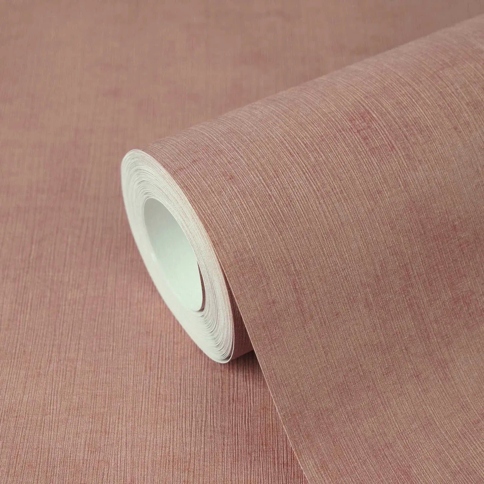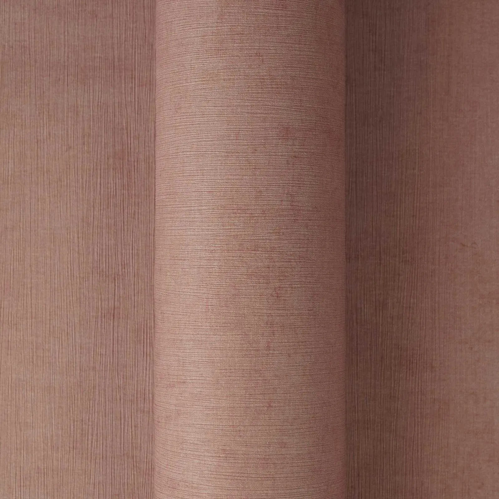 The motif of this wallpaper depicts a fine, delicate texture of irregular vertical lines that look as if they were drawn by hand. The base color is a warm, matte pink tone with soft nuances of dark pink and a slight terracotta hue. The delicate pattern gives the surface a textile character reminiscent of linen fabric. The color palette creates a calming and gentle effect, creating a cozy and inviting atmosphere. The simple design is modern and understated, particularly suited to minimalist or Scandinavian-style interiors where a calm, tasteful backdrop is required.