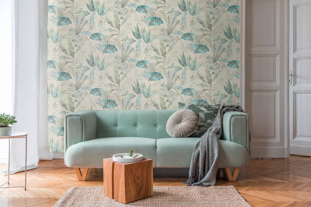 Tapetes ar dažādām lapām: zaļa, krēma, tirkīza, 393484 AS Creation