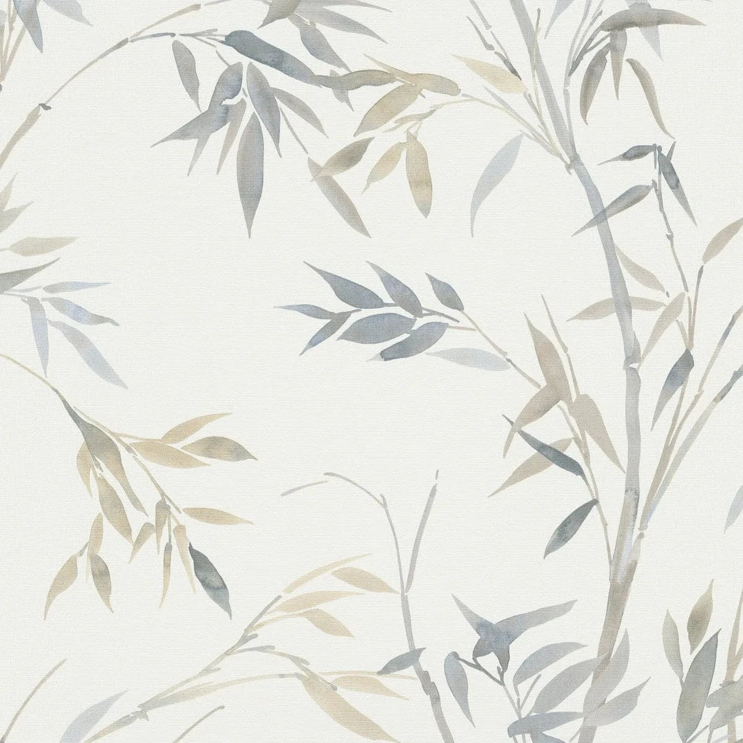 Non-Woven wallpapers with grey tropical leaves on a white background. The matt finish and subtle colour combination create a calm wall design. Erismann (Germany), 0.53x10 m.