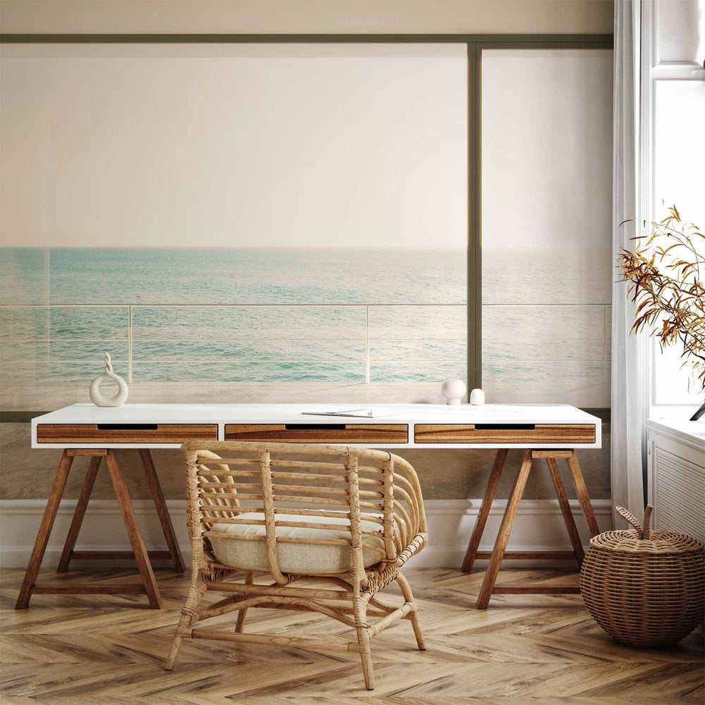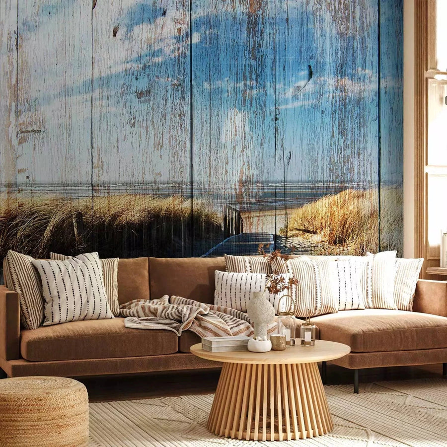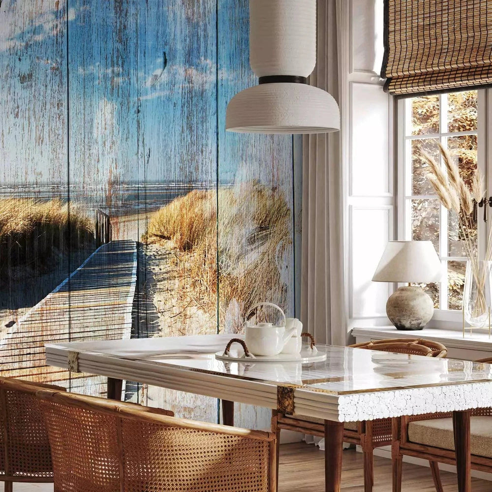 Fototapetes ar jūru - smilšaina pludmale un jūra uz koka fona G-ART