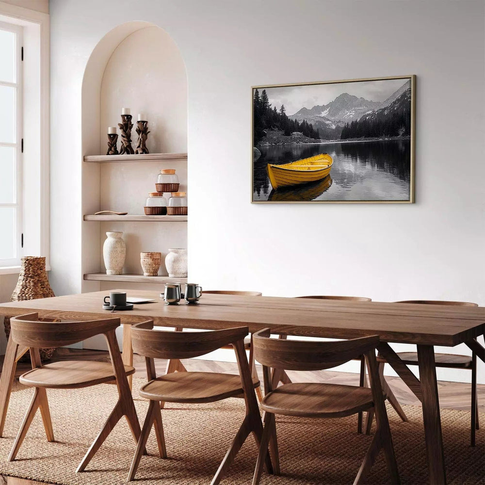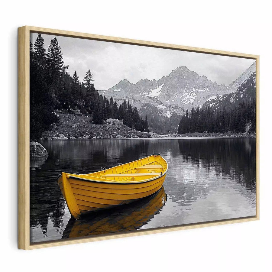 Painting in wooden frame (natural colour) - boat on a mountain lake background, 162557
