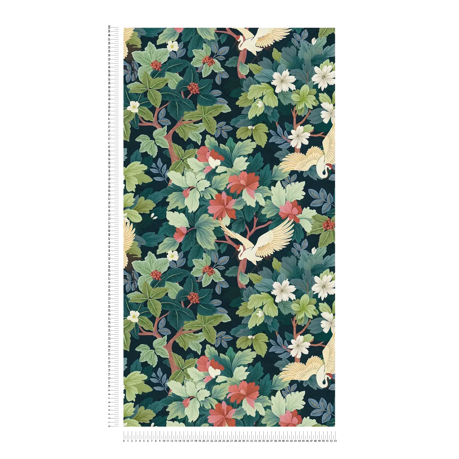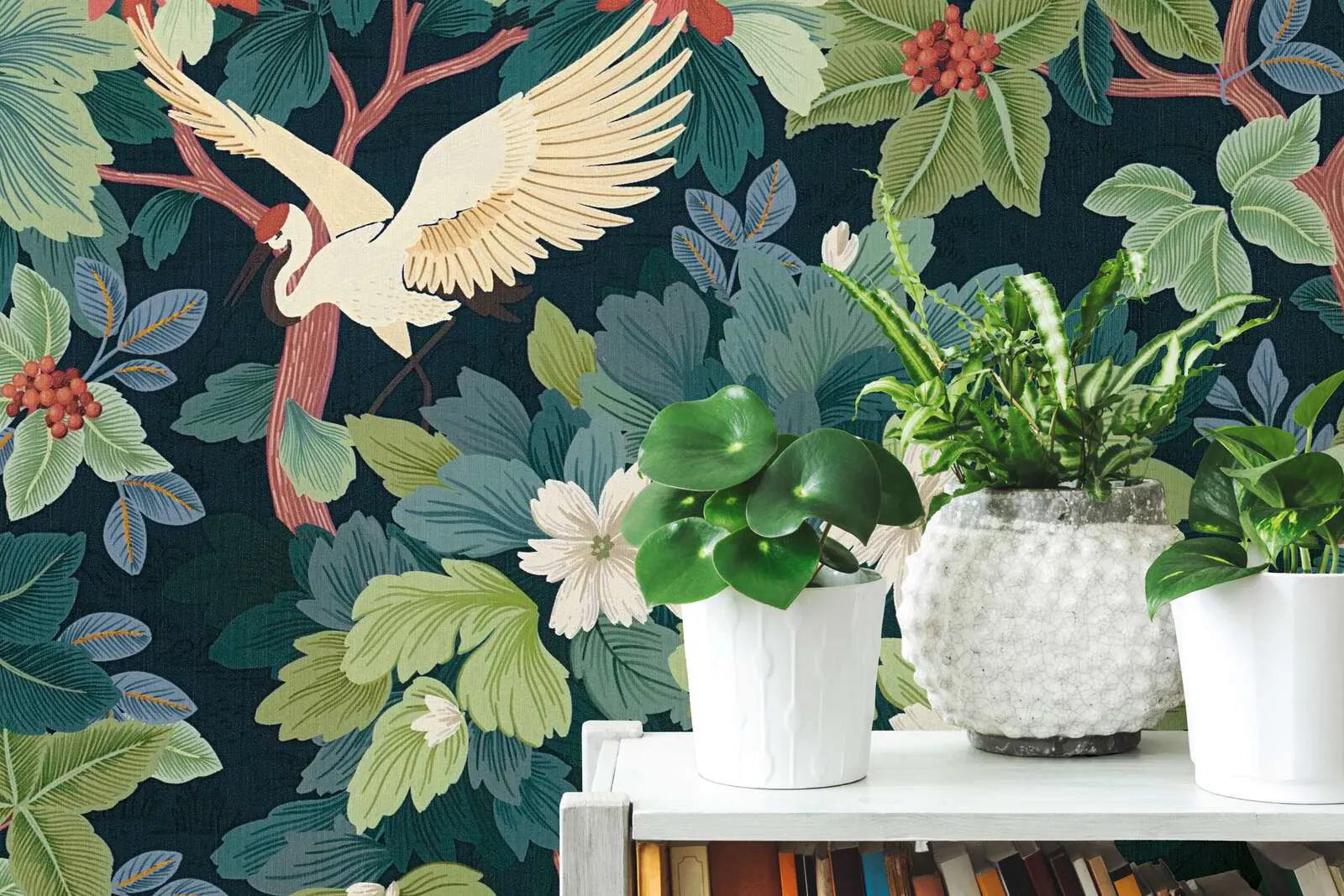Wallpaper with exotic leaf and bird motif, matte finish with light texture | blue, green - 3012466