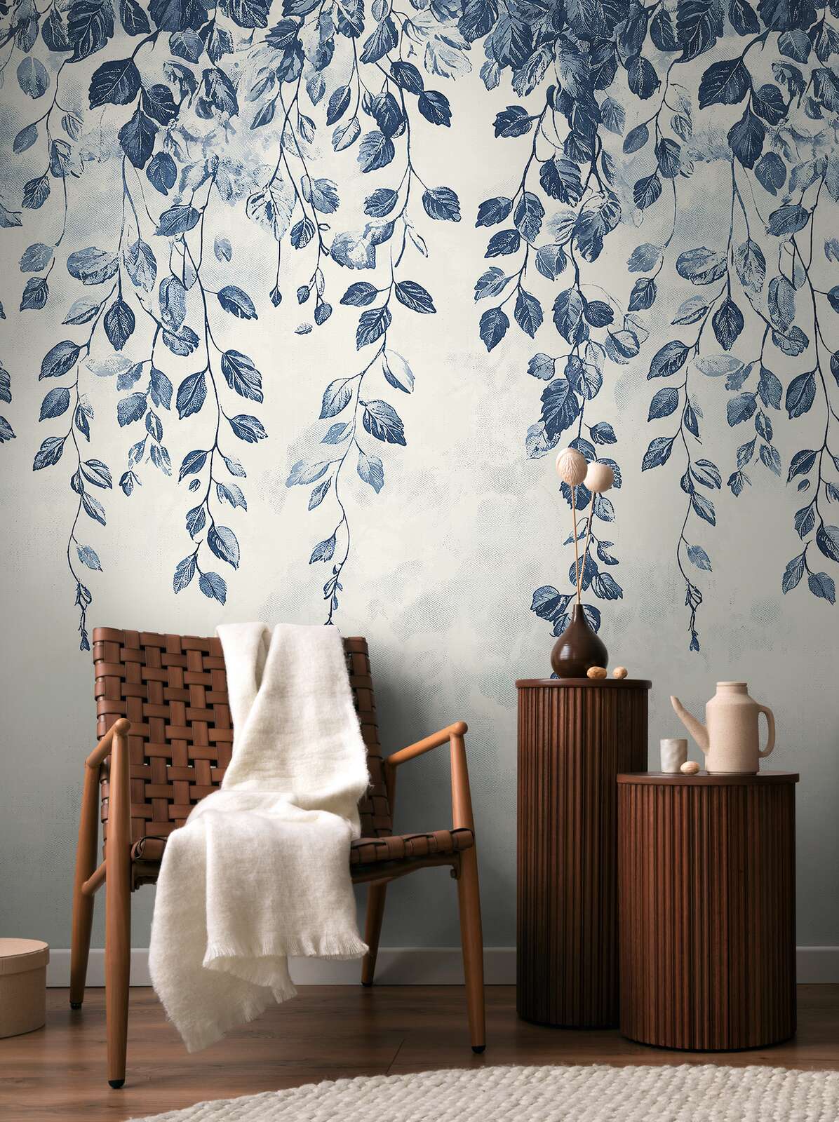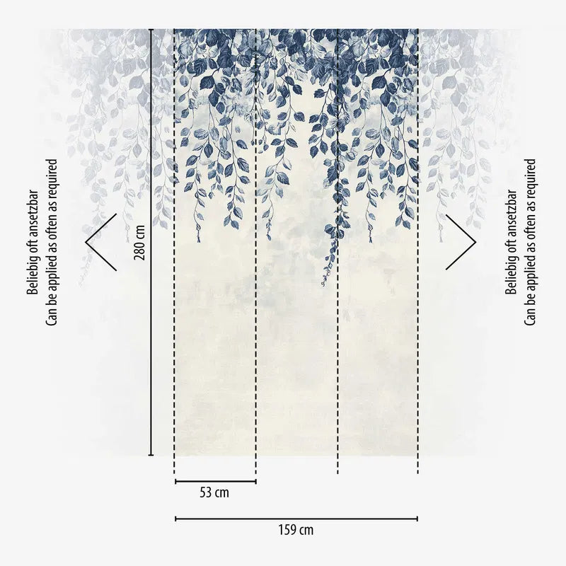 The wallpaper motif depicts an elegant, botanical design in watercolour style. Lush branches with detailed leaves in different shades of blue extend downwards from the top edge of the wallpaper. The leaves look hand-drawn and create a natural yet artistic atmosphere thanks to the fine lines and soft colour transitions. At the bottom, the pattern flows into a delicate, almost cloudy background in soft white and very light shades of blue. The colour palette is dominated by a deep indigo blue, which is particularly pronounced in the leaves, combined with a cool, restrained white that creates calm and clarity. The pattern looks airy and light, almost floating, and gives the room a refreshingly relaxed yet sophisticated atmosphere.