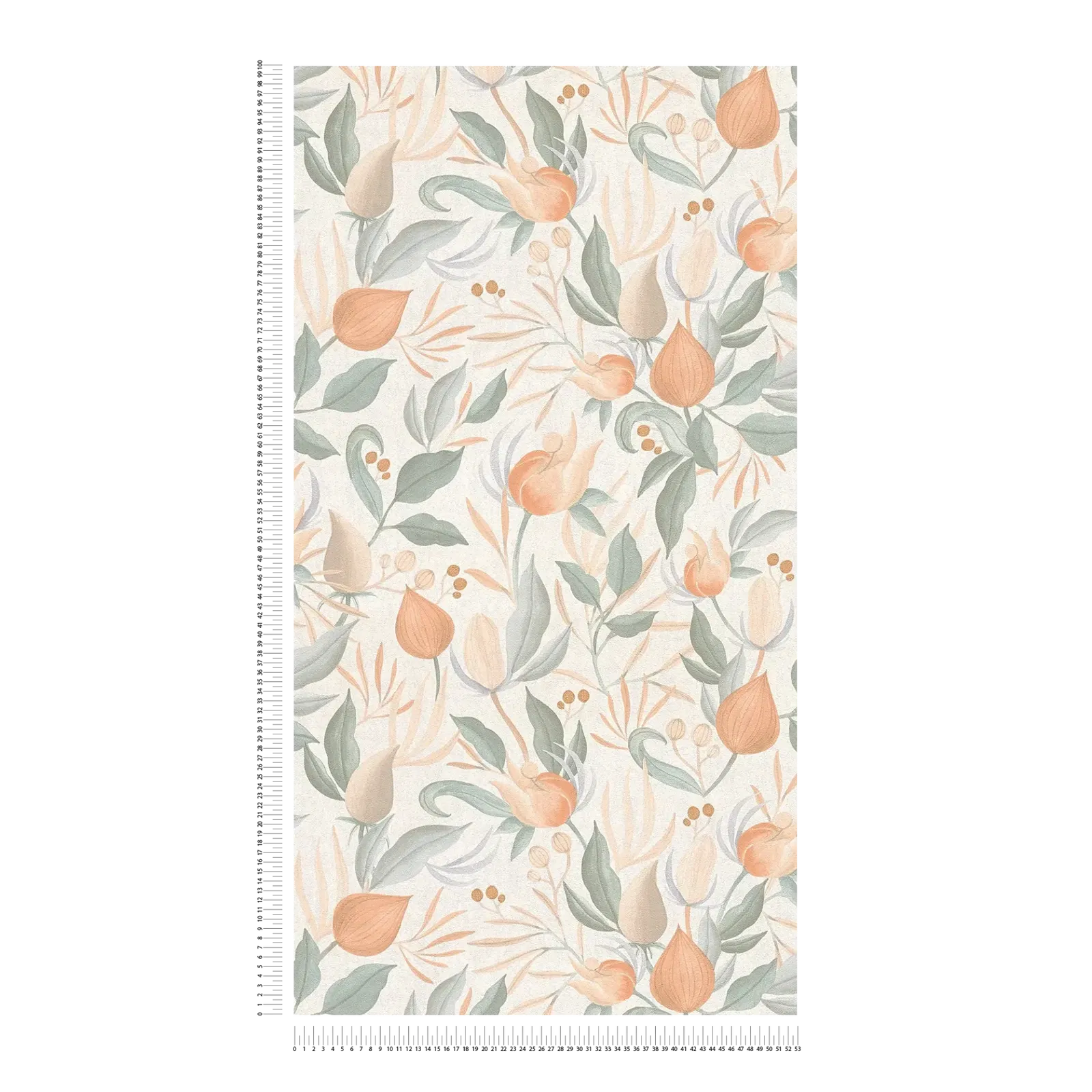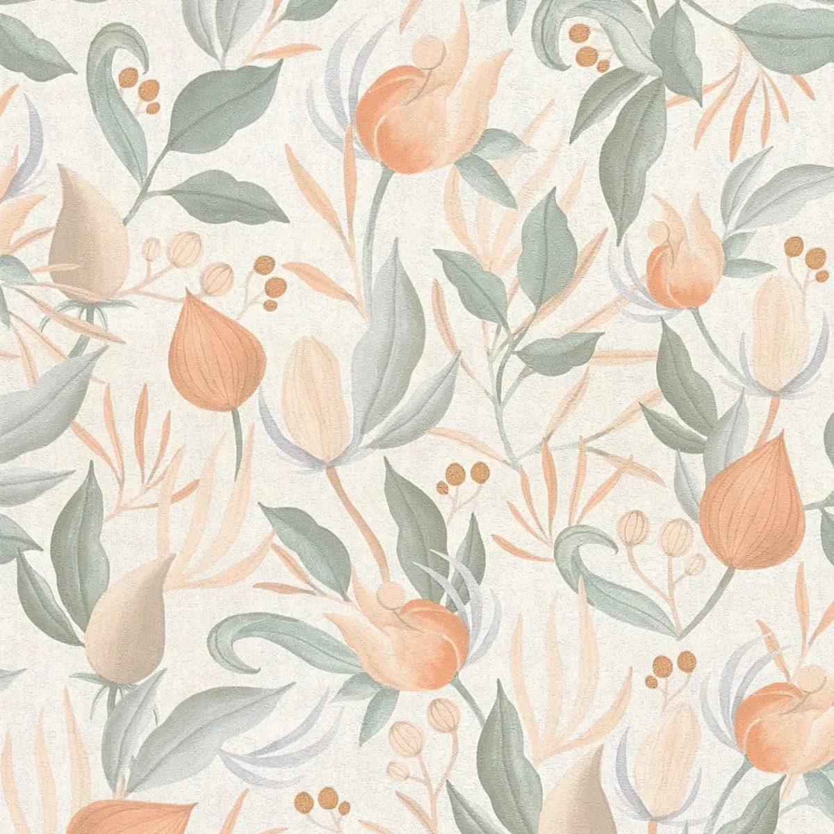Raksts attēlo delikātu ziedu motīvu, kurā stilizēti ziedi un lapas harmoniski saplūst. Krāsu gamma ir maiga un pasteļtoņos: Ziedos dominē maigi persiku un koraļļu toņi, bet lapas ir klusinātos zaļos un salvijas toņos. Atsevišķi akcenti maigā smilškrāsā un smalkos brūnos toņos sadala kopējo ainu. Fons paliek diskrēts, padarot ziedu elementus gaišus un gandrīz peldošus. Kontūras ir maigas un daļēji saplūst, piešķirot rakstam akvareļveida, relaksētu izskatu un dabisku eleganci. Kopumā tapetes rada mierīgu, draudzīgu, bet modernu atmosfēru ar nostalģisku romantikas pieskaņu.
