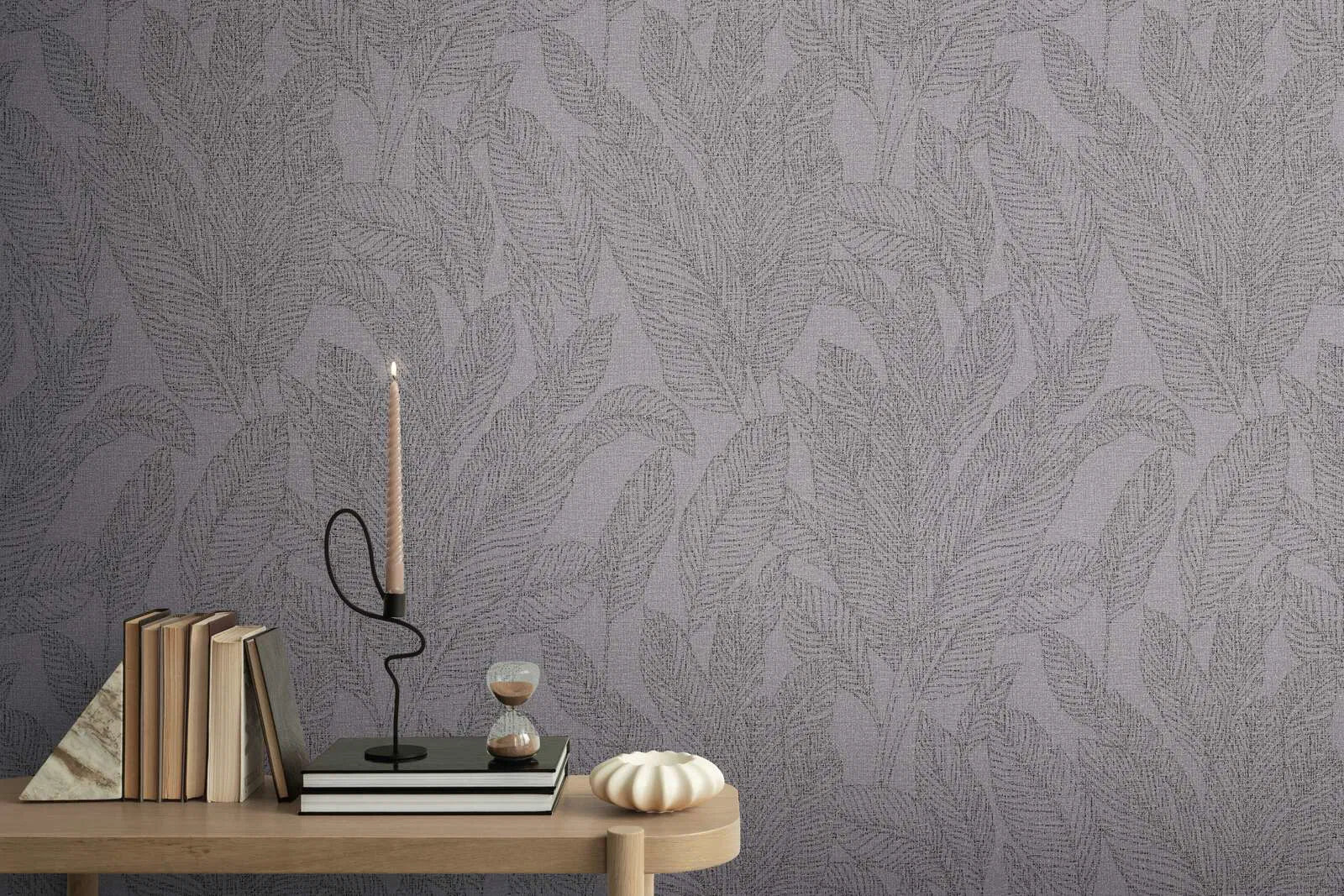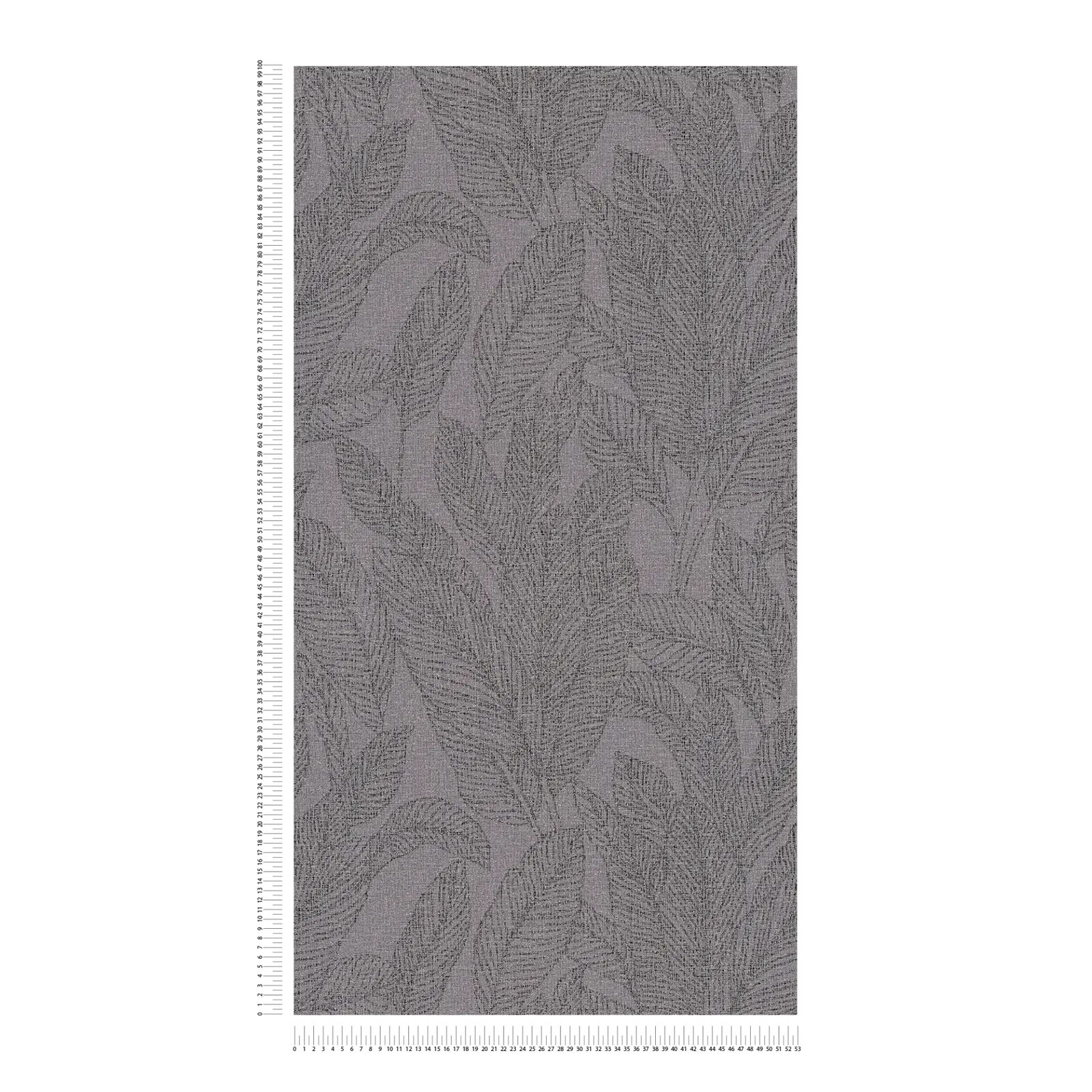 Tapetes raksts ir blīvs lapu dizains ar stilizētām, lielām lapu formām, kas ir bagātīgi izkliedētas pa visu virsmu. Lapas ir zīmētas ar smalkām, tumšākām līnijām, kas rada smalku tekstūru un dziļumu. Fons ir vienmērīgs, matēts pelēks tonis ar gandrīz tekstilam līdzīgu, ļoti smalku un smalku graudu. Kopumā dominē mierīga, vēsa krāsu gamma dažādos pelēkos toņos, ar tumšākiem lapu zīmējumiem, kas nedaudz izceļas uz nedaudz gaišāka fona, neradot asu kontrastu. Stils ir moderns, bet vienlaikus arī mūžīgs, ar pilsētas džungļu pieskārienu un organisku, atturīgu eleganci. Kopējais efekts ir mierīgs, smalks un izsmalcināts, padarot tapetes universālas kombinēšanai – tās ir īpaši piemērotas minimālisma un stilīga interjera koncepcijām, kurās ir vēlama struktūra un dabas pieskāriens.