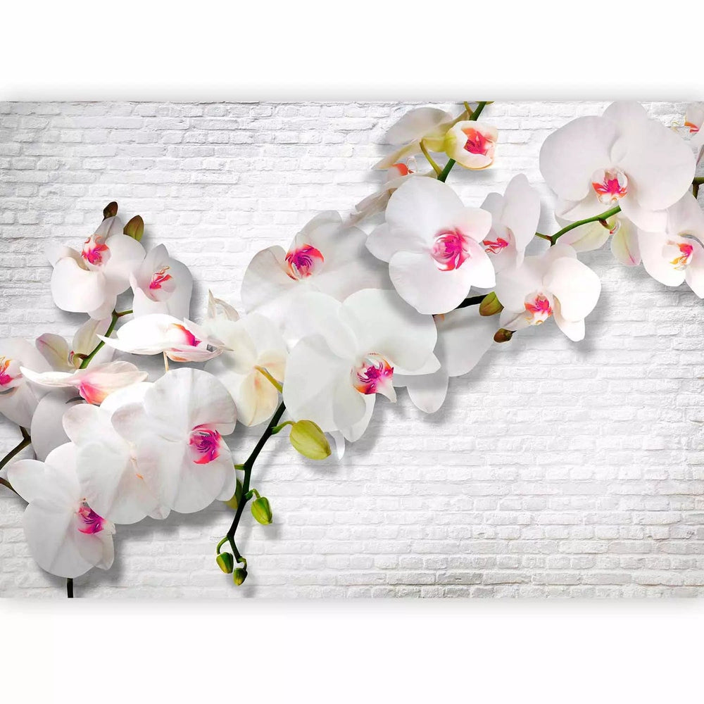 Fototapetes - baltas orhidejas ar baltu ķieģeļu sienu, 61839  G-ART