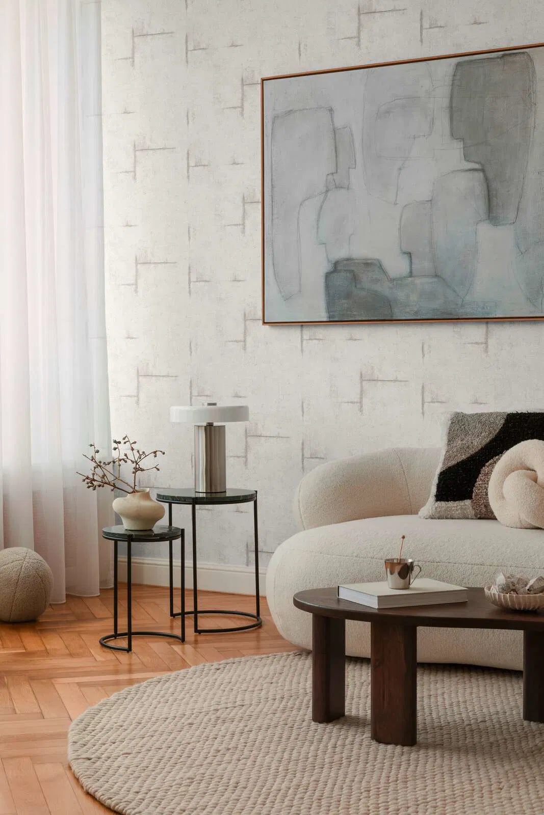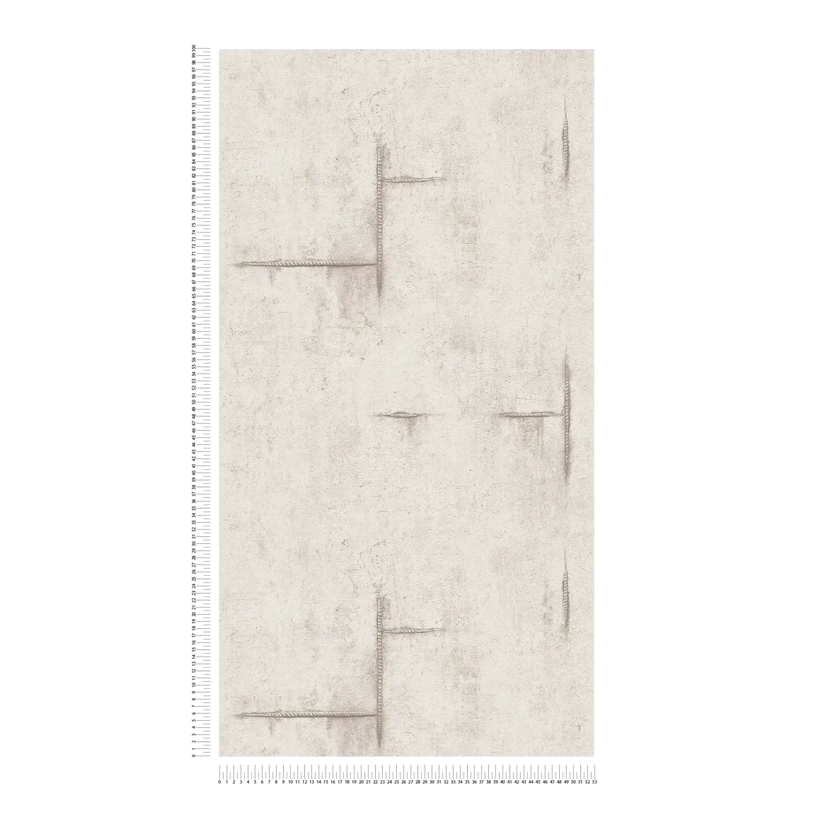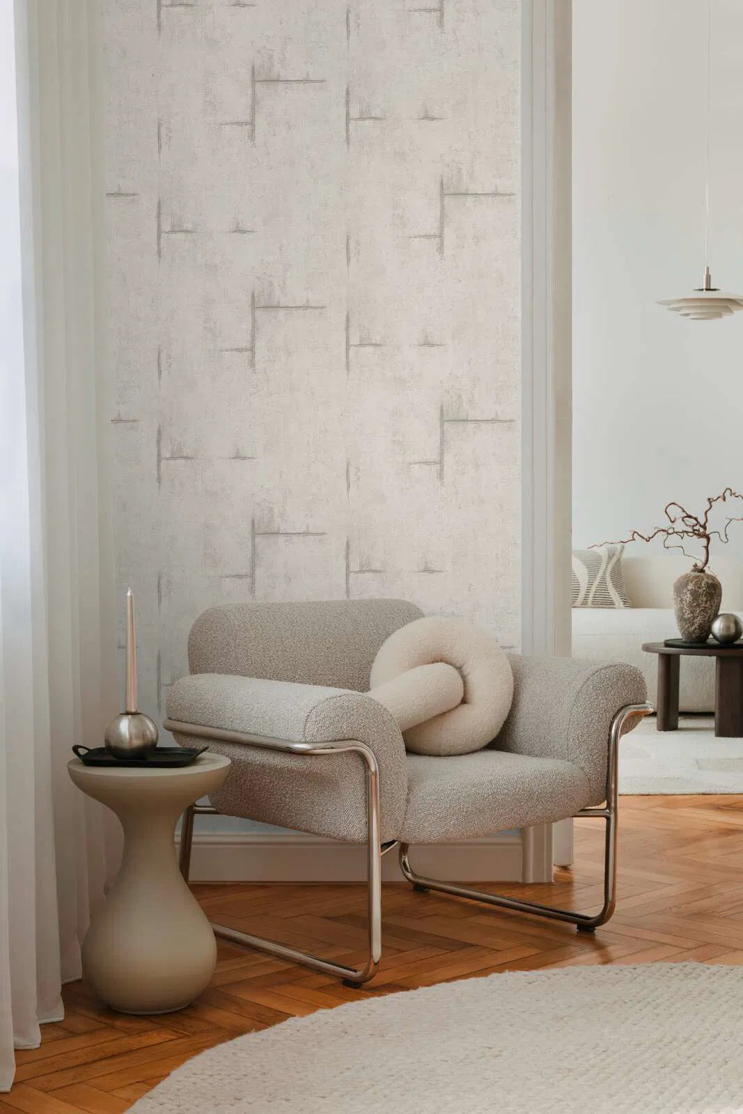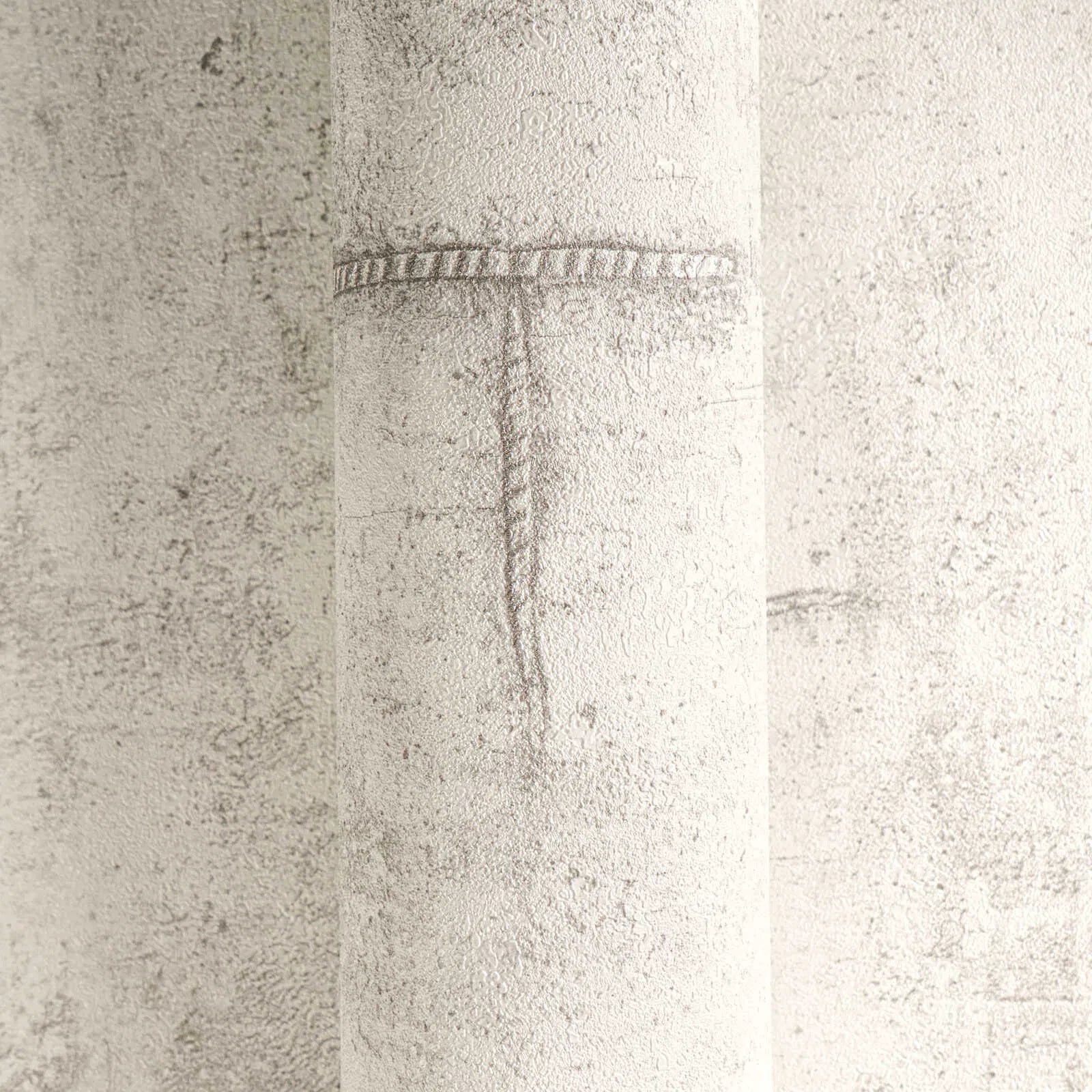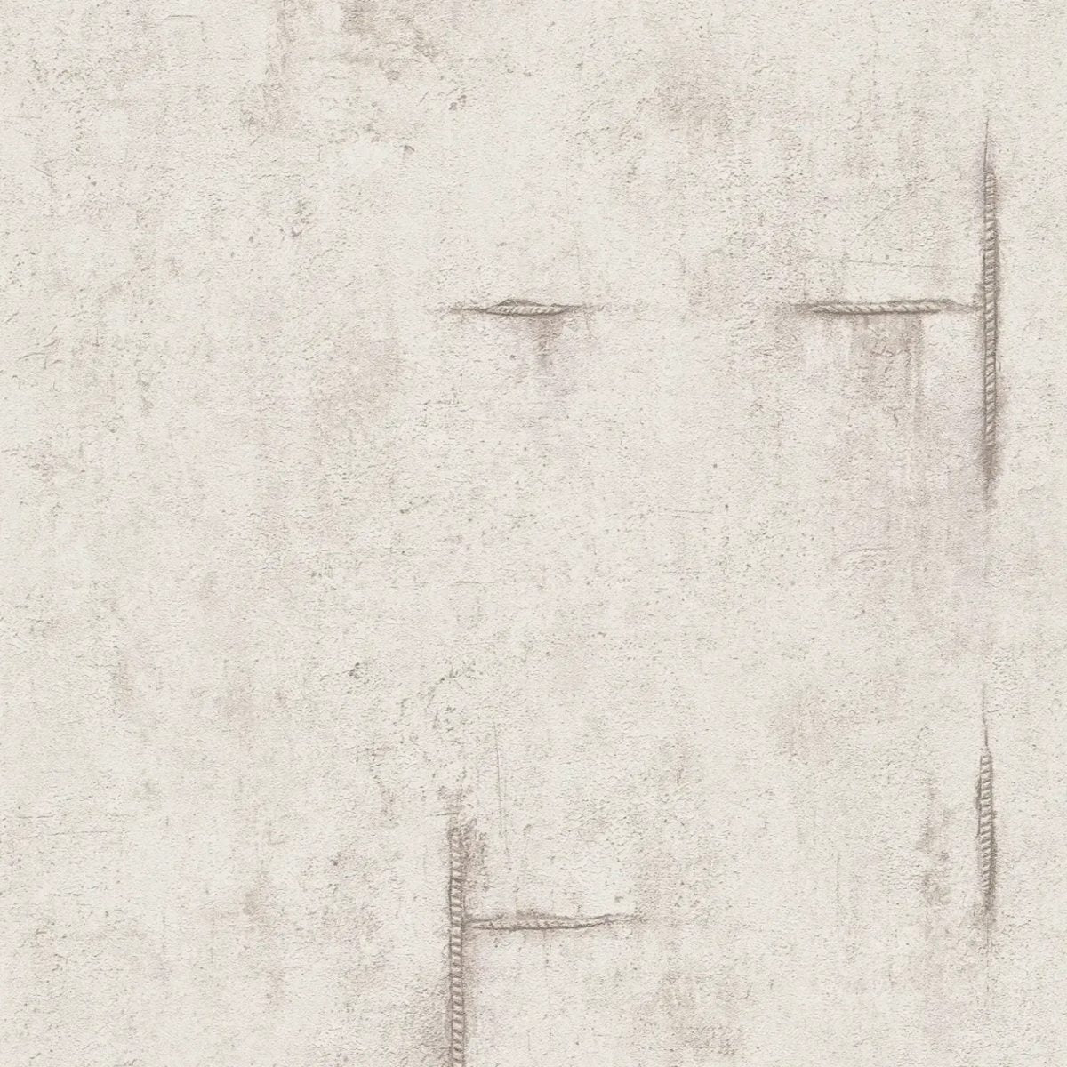 Tapetes motīvs ir minimālisma stilā, ar nedaudz raupju faktūru, gaišā, siltā pelēkā tonī ar nelielu smilškrāsas nokrāsu. Virsma izskatās kā smalks, laika apstākļu ietekmēts apmetums vai betons, piešķirot tai subtīlu industriālu šarmu. Virsma ir izrotāta ar neregulāri izkārtotām, skicētām līnijām un izteiksmīgām malām, kas atgādina grafiskus zīmējumus. Šīs līnijas ir tumšākā pelēkbrūnā krāsā un imitē nedaudz iegravētus vai izgrebtus rakstus, radot fascinējošu savstarpēju mijiedarbību starp atturību un izteiksmīgu akcentu. Neuzkrītošā krāsu gamma rada mājīgu, neuzbāzīgu atmosfēru un veido ideālu fonu modernam un urbānam interjeram. Subtila lietota izskata un ģeometrisko elementu kombinācija telpai piešķir arī izsmalcinātību un mūžīgumu.