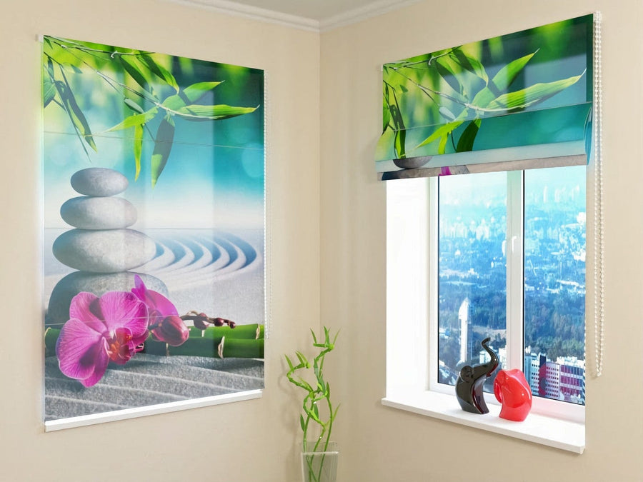 Romiešu žalūzijas ar austrumu tematiku  - Rozā orhidejas zen dārzā Tapetenshop.lv