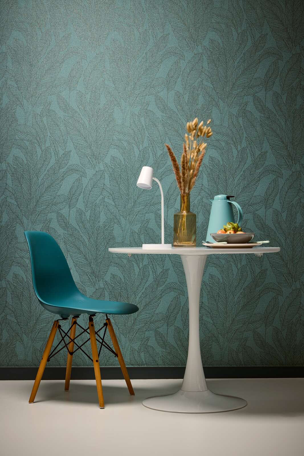 Tapetes raksts attēlo stilizētu lapu motīvu, kurā lielas, organiski izliektas lapas pārklājas dažādos virzienos. Lapas ir attēlotas ar smalkām līniju struktūrām, kas stiepjas pa visu virsmu, radot noteiktu dziļumu. Krāsu gamma raksturojas ar klusu, zili zaļu toni, gan fonam, gan motīvam esot līdzīgās krāsās, radot harmonisku, mierīgu kopējo iespaidu. Ar savu kluso krāsu paleti un dabisko rakstu paklājs izstaro relaksētu, nedaudz eksotisku atmosfēru, kas ir gan nomierinoša, gan eleganta. Stils ir moderns ar retro pieskaņu, piešķirot telpai mājīgu, bet vienlaikus mūsdienīgu izjūtu.