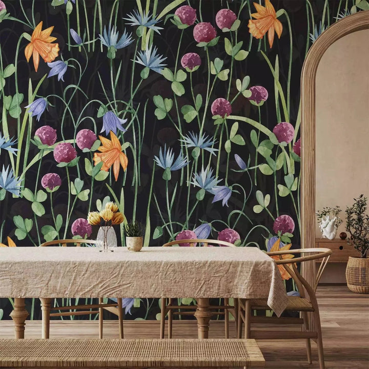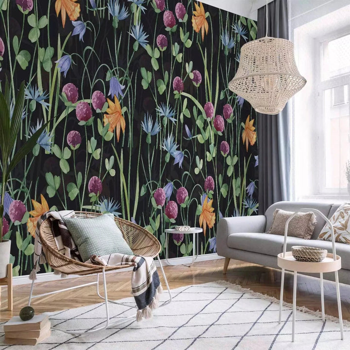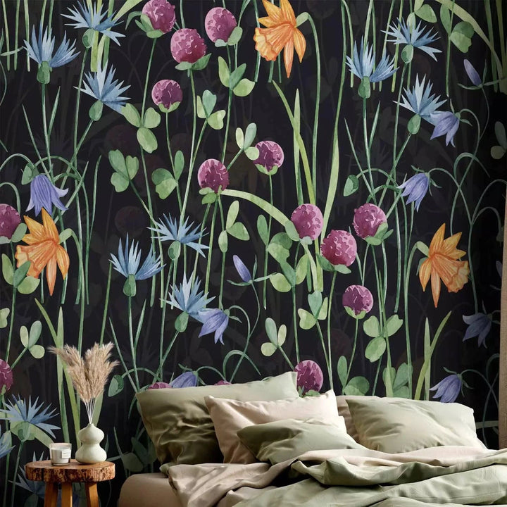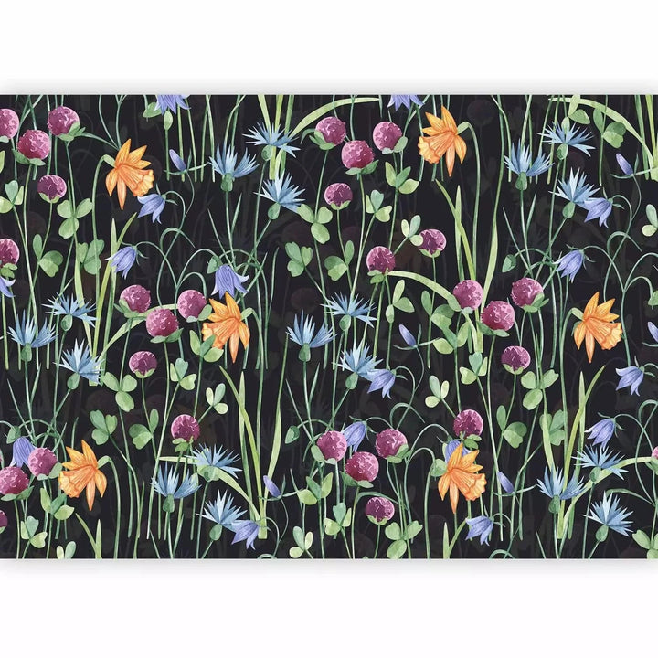 Fototapeet - Suvine heinamaa - metsikud lilled ja rohi mustal taustal, 160409