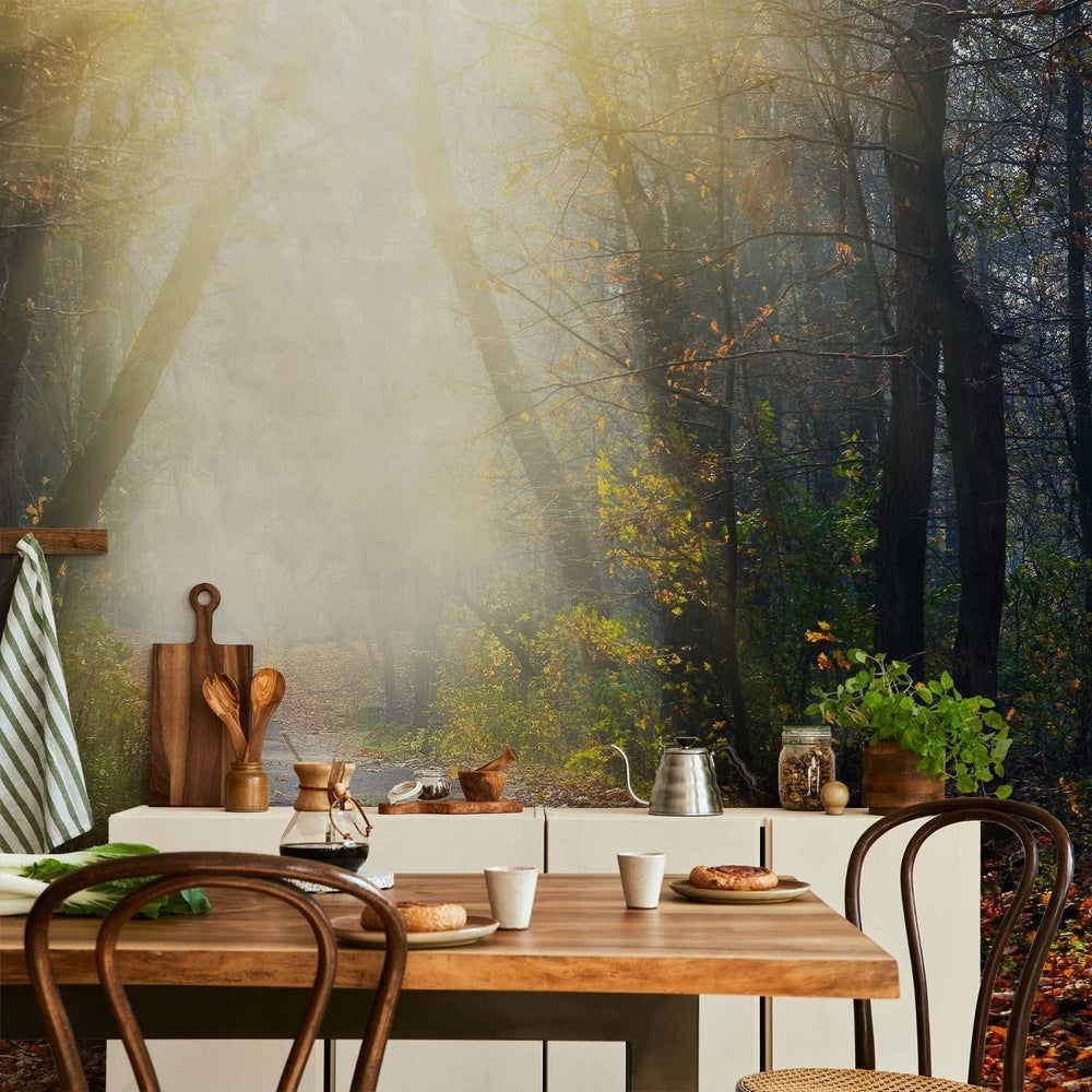 Lētas fototapetes - Meža ainava ar kokiem rudens miglā, pirkt G-ART