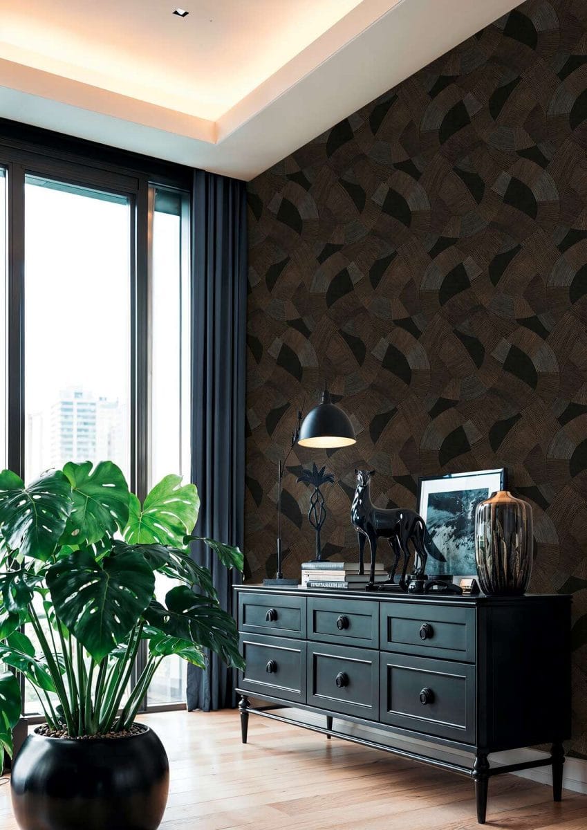 Ilmeikäs tapetti, jolla on vahva luonne ja hienoinen kiilto pinnalla. Se on helppo huoltaa ja erittäin kestävä. 64 cm:n kuviotoisto takaa tarkan geometrisen muodon yhdistämisen. Mustan ja ruskean värien yhdistelmä luo dramaattisen mutta tasapainoisen vaikutelman. Hienot viivat ja pyöreät muodot pehmentävät tummien sävyjen vakavuutta ja antavat sisustukselle maskuliinista eleganssia ja vakautta. Tämä malli sopii erinomaisesti suuriin huoneisiin, toimistoihin tai korostusseinäksi, joka herättää huomiota graafisella tiukkuudellaan ja materiaalin laadullaan.