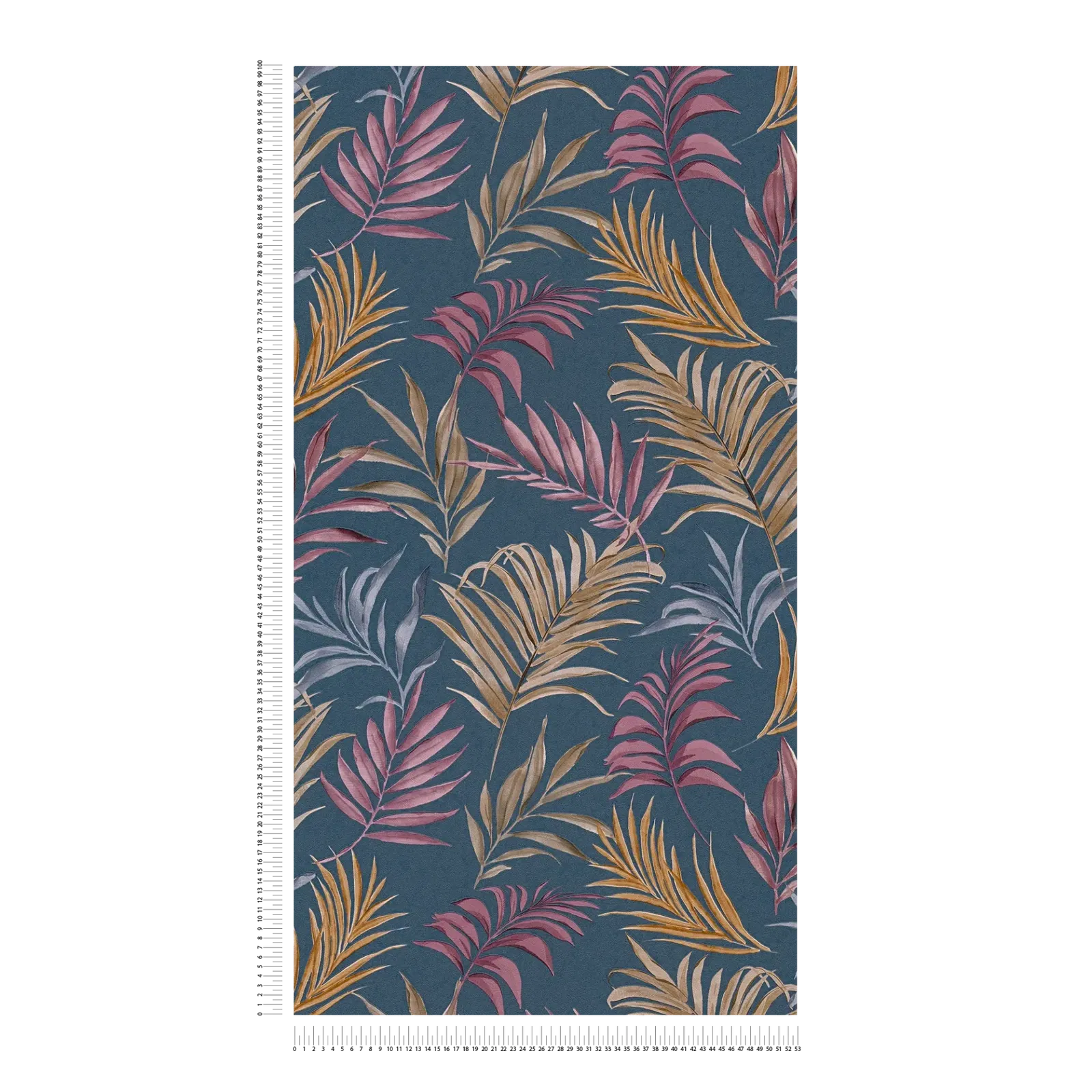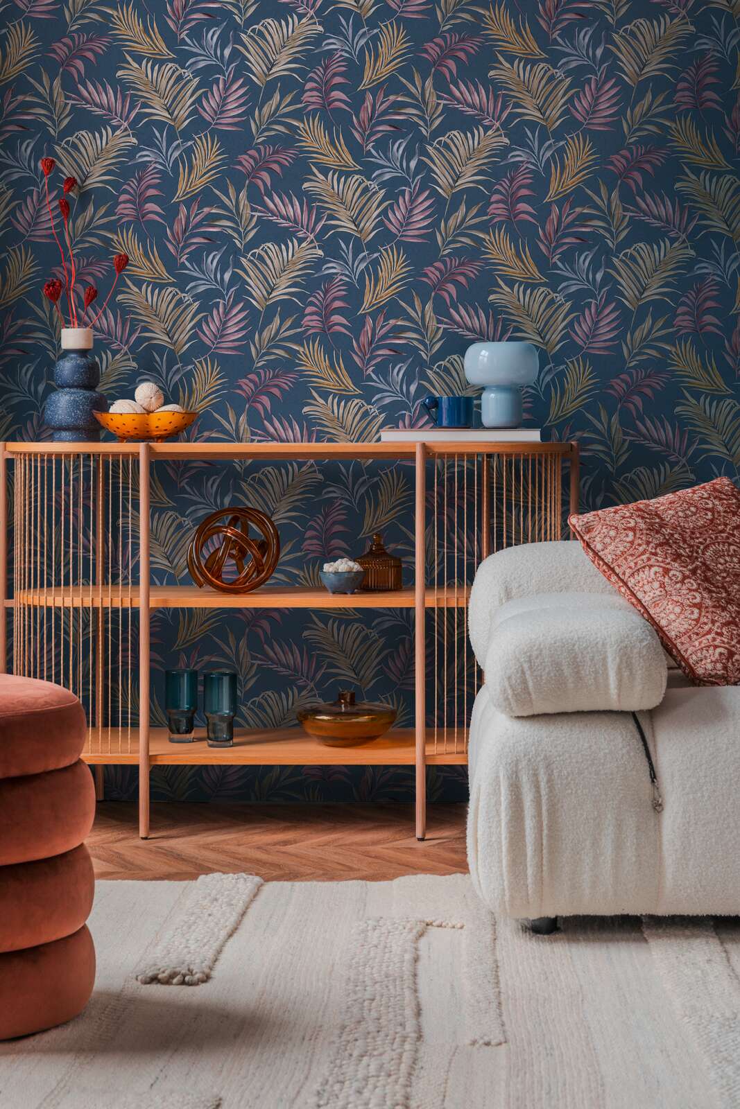 Selle tapeedi muster koosneb lõdvalt paigutatud, stiliseeritud palmi- ja sõnajalgadest, mis on hajutatud rikkalikul, sügavsinisel taustal. Lehed on kujutatud harmoonilises värvipaletis, kus domineerivad soe sinepikollane, vaikne lilla, sinilillat ja jahe hallsinine. Kontuurid ja varjundid loovad maalilise, akvarellilaadse efekti, mis annab motiividele kerguse ja peaaegu tekstiilsügavuse. Värvid on elegantsed ja rahustavad, samal ajal kui lilleline kujundus loob troopilise, eksootilise atmosfääri. Kokkuvõttes annab tapeet tasakaalustatud moodsuse ja loodusläheduse tunnet, kus jaheda tausta ja soojade, mahedate lehevärvide kombinatsioon loob hubase, kuid samas stiilse ruumiefekti.