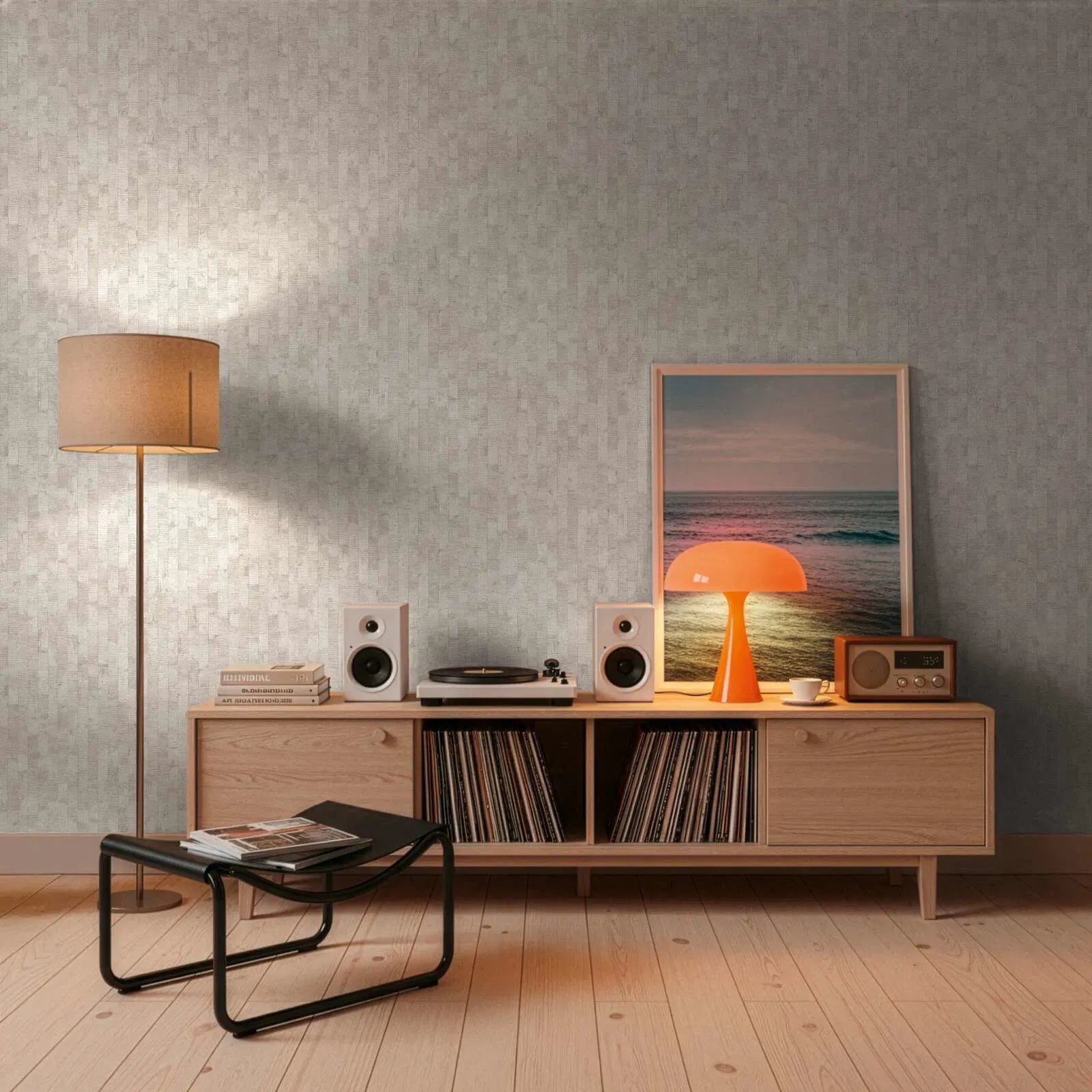 Tapeedi mustril on tagasihoidlik, vertikaalselt paigutatud triibuline disain, mida iseloomustavad veidi erinevad halli ja valge toonid. Üksikud triibud on paigutatud nagu kitsad, veidi üksteisega kattuvad plaadid või puitpaneelid, peene tekstuuri ja väikeste ebaühtlaste kujunditega, mis muudavad pinna elavamaks. Värvipalett on väga heleda, neutraalse ja sõbraliku tooniga, luues rahustava ja õhulise atmosfääri. Peen tekstuur loob loomuliku, käsitsi valmistatud iseloomu ja näeb välja modernne, minimalistlik ja kaasaegne. Pehmed värviüleminekud ja lihtne paigutus muudavad selle mustri eriti sobivaks ruumidesse, kus soovitakse tagasihoidlikku ja lõõgastavat efekti.