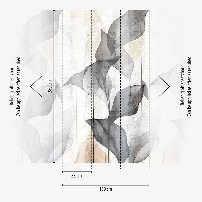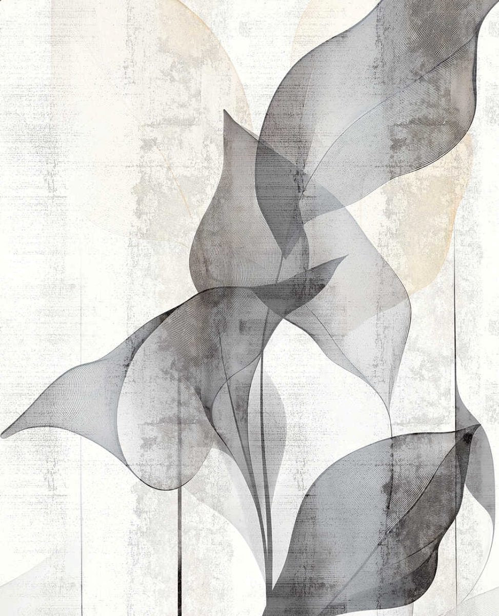 Suuret, herkät lehdet limittyvät kerroksittain ja muistuttavat orgaanisia kasvinmuotoja. Lehdet ovat läpikuultavia harmaan sävyissä vaaleasta tummaan, ja taustalla näkyy toisinaan pehmeän beigen ja kerman sävyjä. Hienot linjat ja kevyet varjot antavat motiiville syvyyttä, kun taas ääriviivat ovat tarkoituksellisen herkkiä ja läpinäkyviä. Taustapinta on hieman kuvioitu, melkein kuin kulunut rappaus, ja täydentää siten tapetin eleganttia ja modernia ilmettä. Kaiken kaikkiaan kuvio luo rauhallisen, tyylikkään tunnelman, jossa on hieman runollinen, lähes leijuva vaikutus. Harmoninen, neutraali väripaletti saa huoneen tuntumaan kevyeltä ja ilmavalta ja luo samalla rauhoittavan ja tyylikkään vaikutelman.