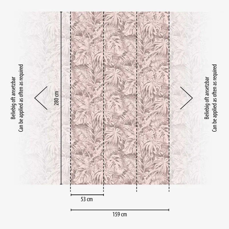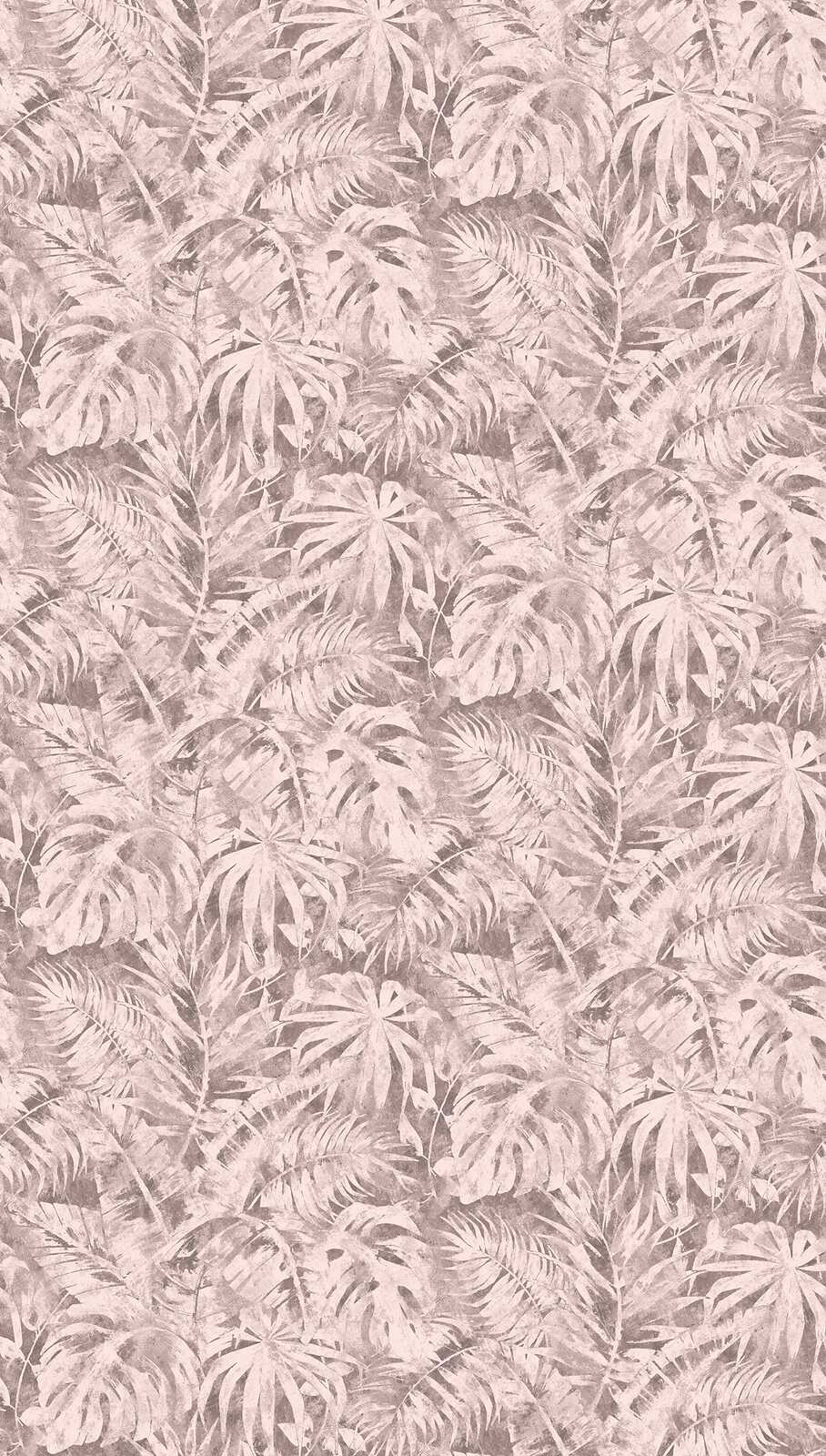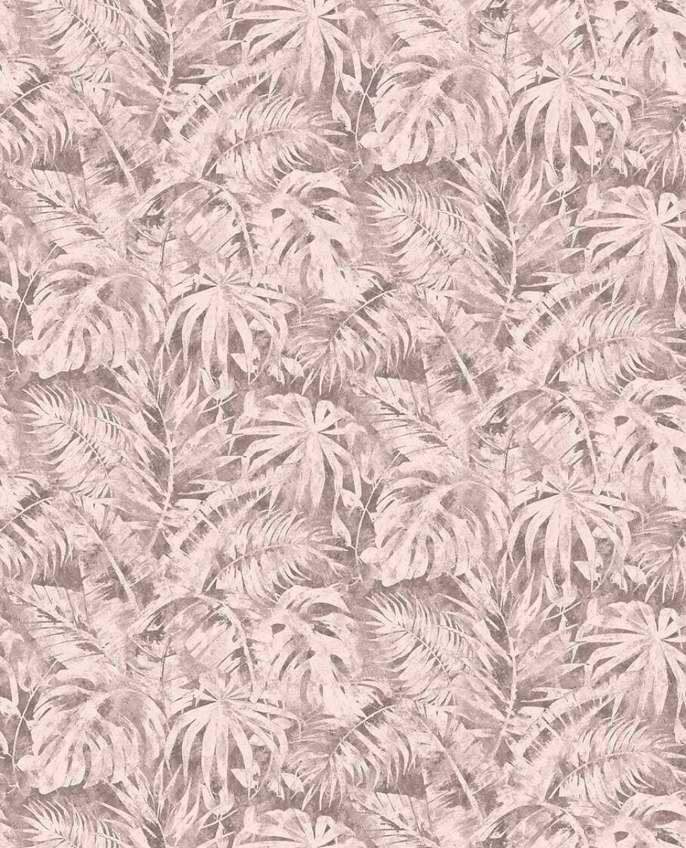 Motiivi kuvaa värikästä lehtikuviota, joka koostuu erilaisista trooppisista kasveista, kuten monstera- ja palmunlehdistä, jotka ovat jakautuneet tasaisesti koko pinnalle. Lehdet on suunniteltu filigraanikuvioiksi, joissa on monia hienoja yksityiskohtia ja päällekkäisyyksiä, jotka yhdessä luovat eloisan mutta harmonisen vaikutelman. Väripaletti on herkkä, jauhemaisen harmaanruskean ja vaaleanpunaisen sävyissä, mikä antaa kuviolle hillityn, lähes yksivärisen luonteen. Se luo hienovaraista, eleganttia tunnelmaa, jossa on vintage-viehätystä. Trooppisten lehtien ja pehmeiden värien yhteispeli luo rauhallisen, rennon vaikutelman ja saa huoneen tuntumaan kodikkaalta ja modernilta.