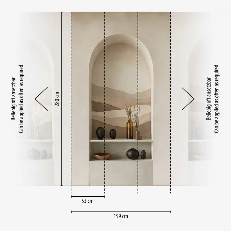 Pehmeät, aaltoilevat viivat beigen, hiekan ja ruskean eri sävyissä on järjestetty kerroksittain koko tapettiosassa. Motiivi muistuttaa rauhallista dyynimaisemaa tai tasaisia kukkuloita, ja eri värivyöhykkeiden väliset siirtymät ovat sujuvia ja loivia. Hienovaraiset värisävyt luovat lämpimän, rauhoittavan tunnelman ja näyttävät kaiken kaikkiaan hyvin harmonisilta ja luonnollisilta. Tyyli on minimalistinen ja moderni, ja siinä on hieman 70-luvun estetiikkaa muistuttavaa retroa. Orgaaniset linjat ja maanläheiset sävyt luovat ajattoman, tyylikkään yleisilmeen, joka huokuu sekä viihtyisyyttä että tyylikästä pidättyvyyttä.