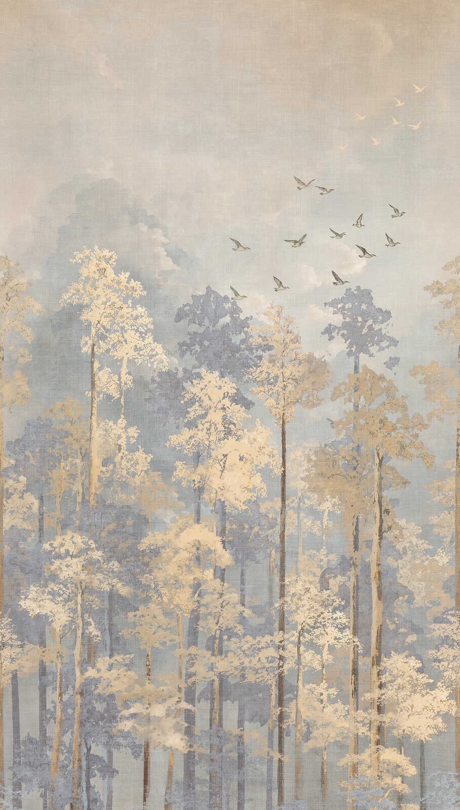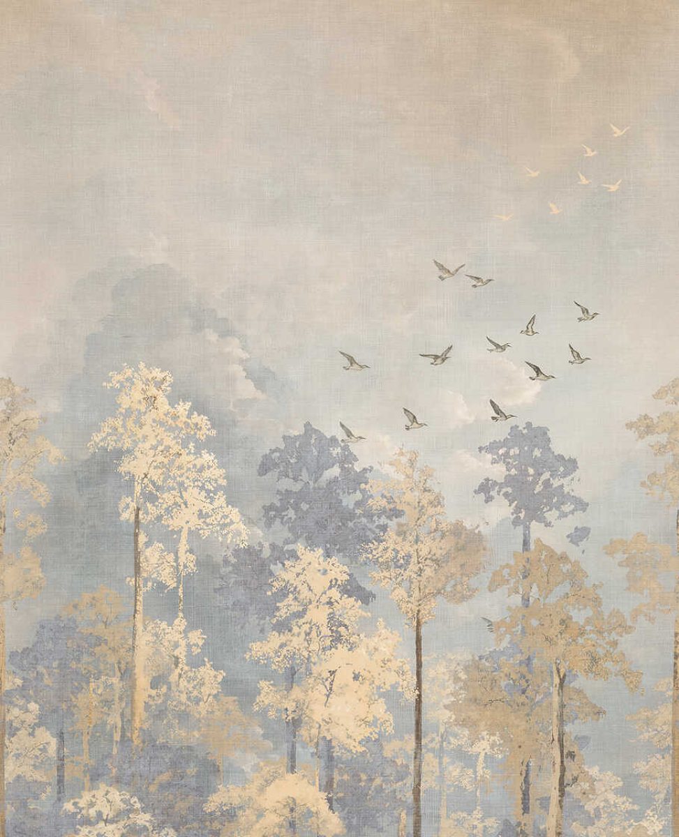 Herkkä, unenomainen metsämaisema, jossa on korkeita, hoikkia puita, joiden lehdet ovat hienovaraisia beigen ja sinisen sävyjä. Värit sulautuvat lempeästi toisiinsa ja luovat rauhallisen, lähes sumuisen tunnelman, aivan kuin metsä olisi aamuyöllä. Kuvan yläosassa lintuparvi lentää tyylikkäässä muodostelmassa, mikä tuo rauhalliseen maisemaan keveyttä ja liikettä. Tausta on käsitelty pehmeillä pastellisävyillä, ja puiden latvojen siluetit erottuvat tunnelmallisesti hienovaraisesti maalattua taustaa vasten. Kokonaisvaikutelma on rauhoittava, tyylikäs ja ajaton - täydellinen rentoon, harmoniseen sisustukseen.
