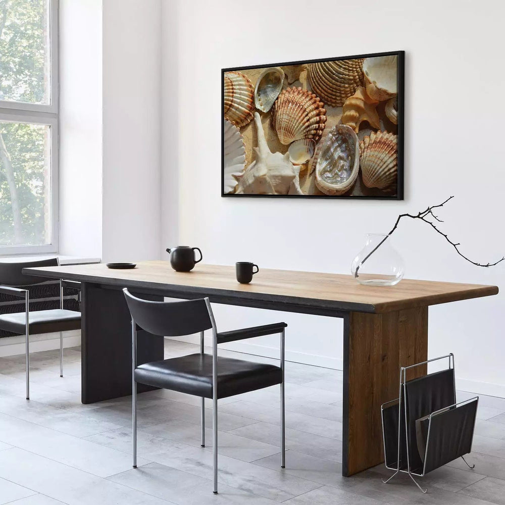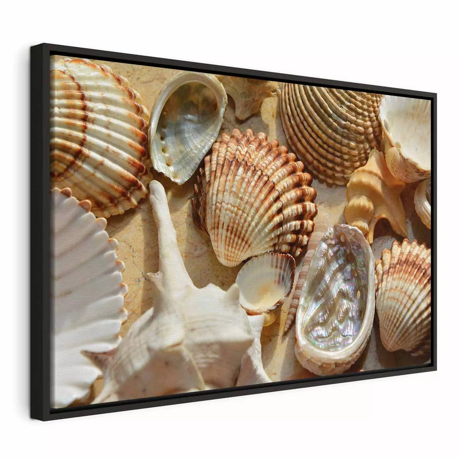 Maalaus mustassa puukehyksessä - kokoelma eri rakenteisia ja muotoisia simpukankuoria, 162560