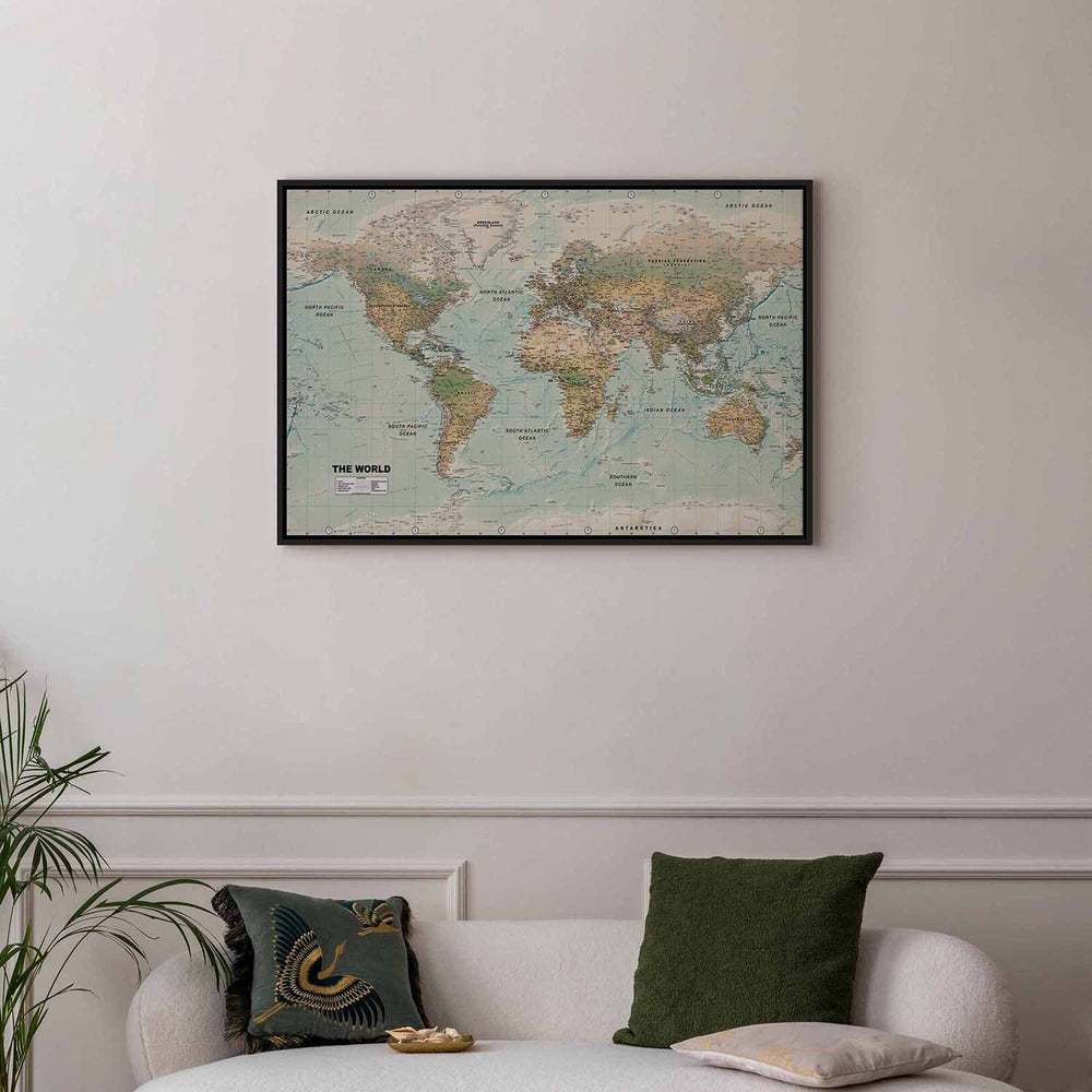 Maalaus mustassa puukehyksessä - Maailmankartta: Kaunis maailma