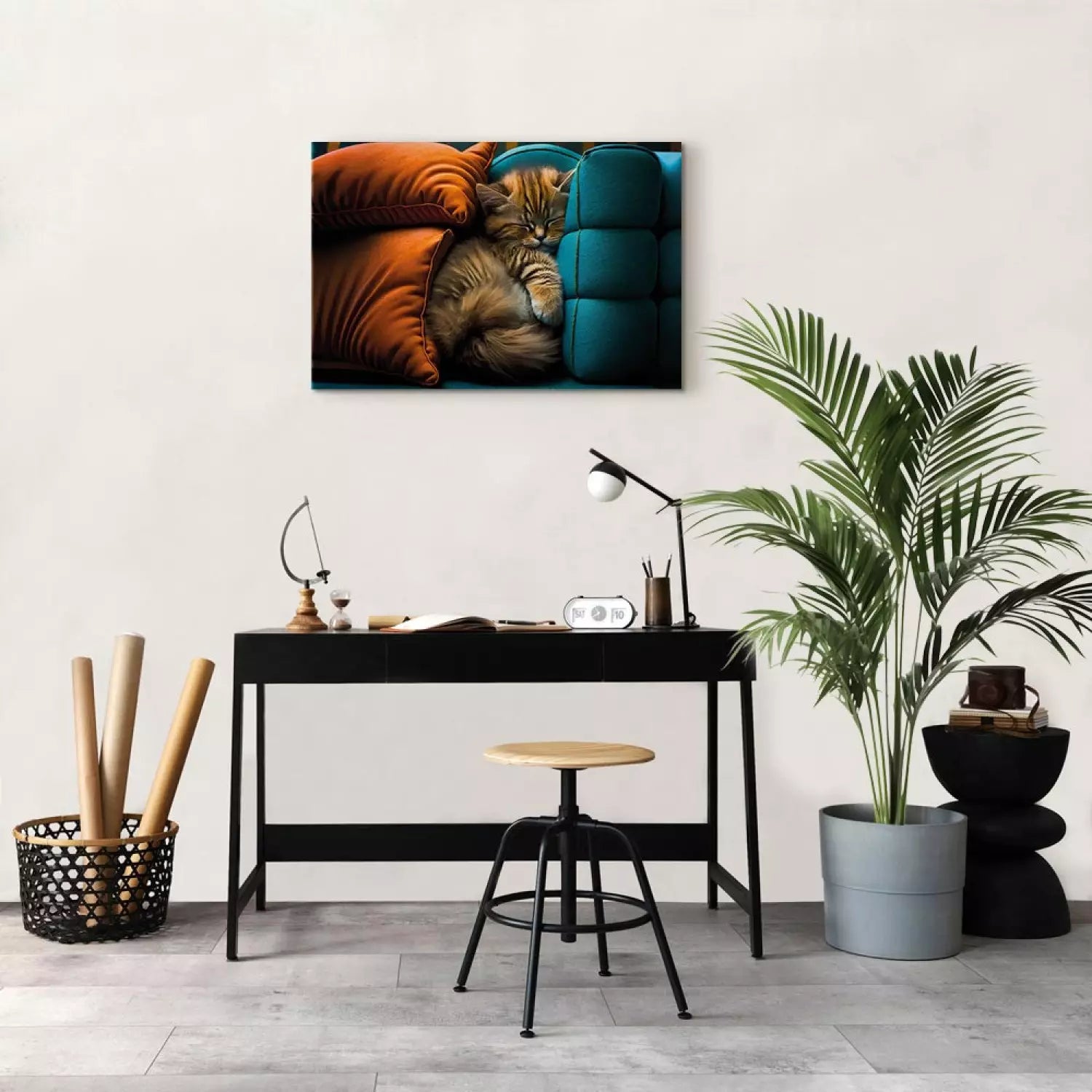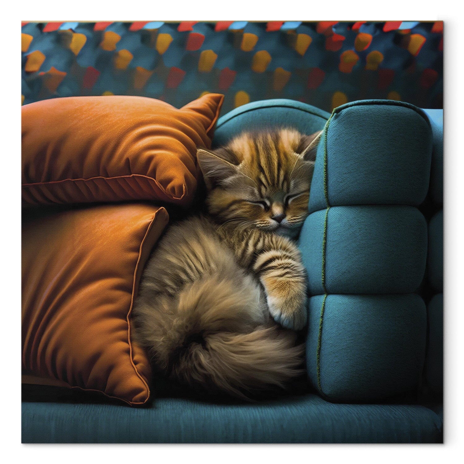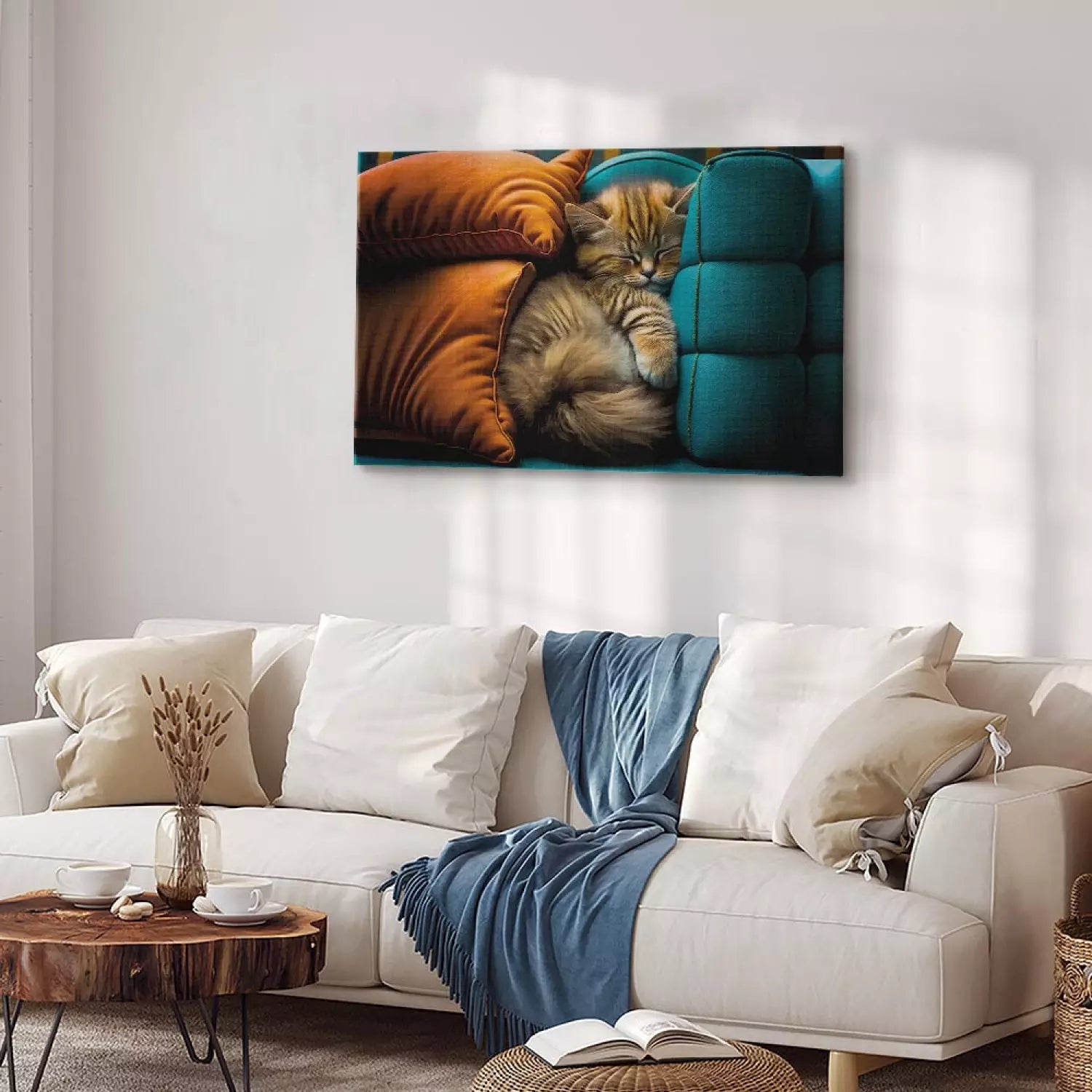 Canvas-taulut - Suloinen kissa nukkuu pehmeiden tyynyjen välissä, 150185