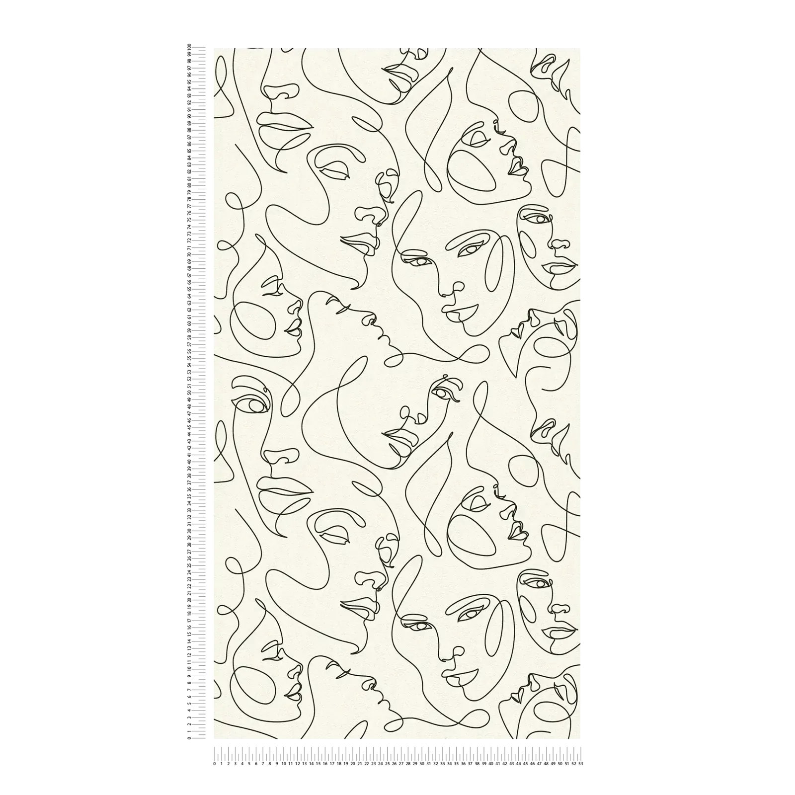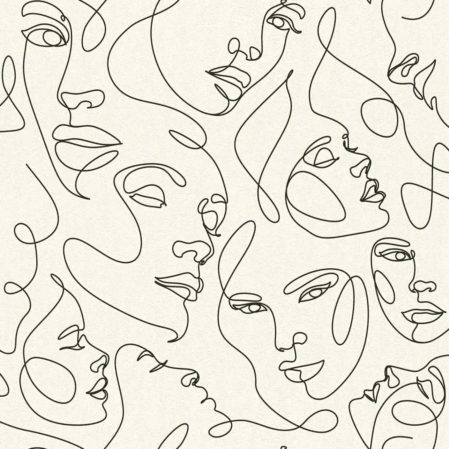 Tapettikuvio on tyyliltään minimalistinen ja koostuu ohuista mustista viivoista valkoisella pohjalla. Viivat muodostavat abstrakteja kasvoja ja muotoja, jotka näyttävät olevan piirretty yhdellä jatkuvalla vedolla, ikään kuin ne olisi piirretty ilman minkäänlaista erottelua. Motiivit ovat minimalistisia ja moderneja, korostaen ääriviivoja ja olennaista, mikä antaa kuviolle elegantin ja ajattoman vaikutelman. Väripaletti on yksivärinen, mikä antaa kuviolle rauhallisen mutta ilmeikkään tunnelman. Viivojen runsaus luo ilmavan vaikutelman, joka antaa huoneelle keveyttä ja taiteellista hienostuneisuutta.