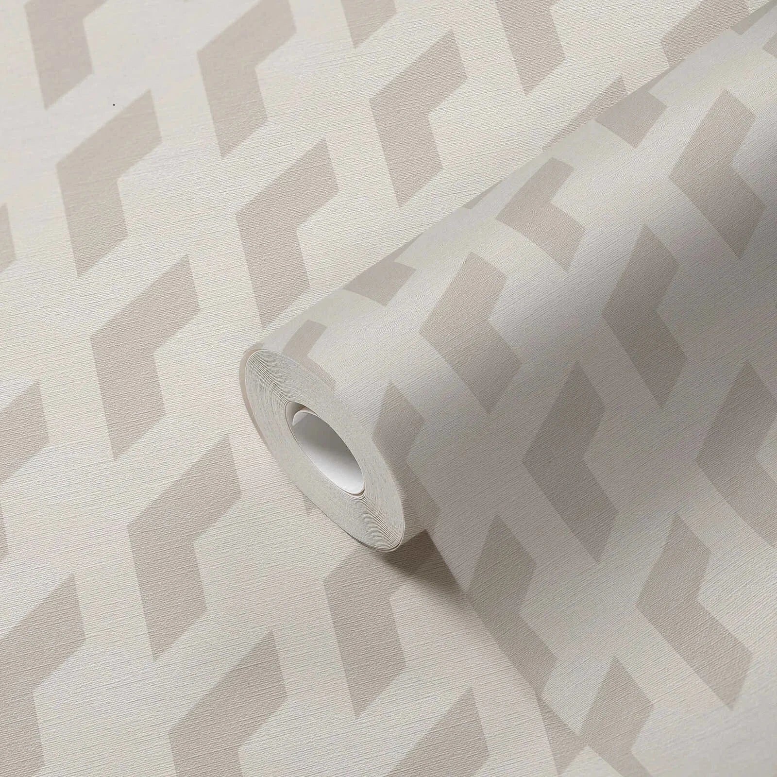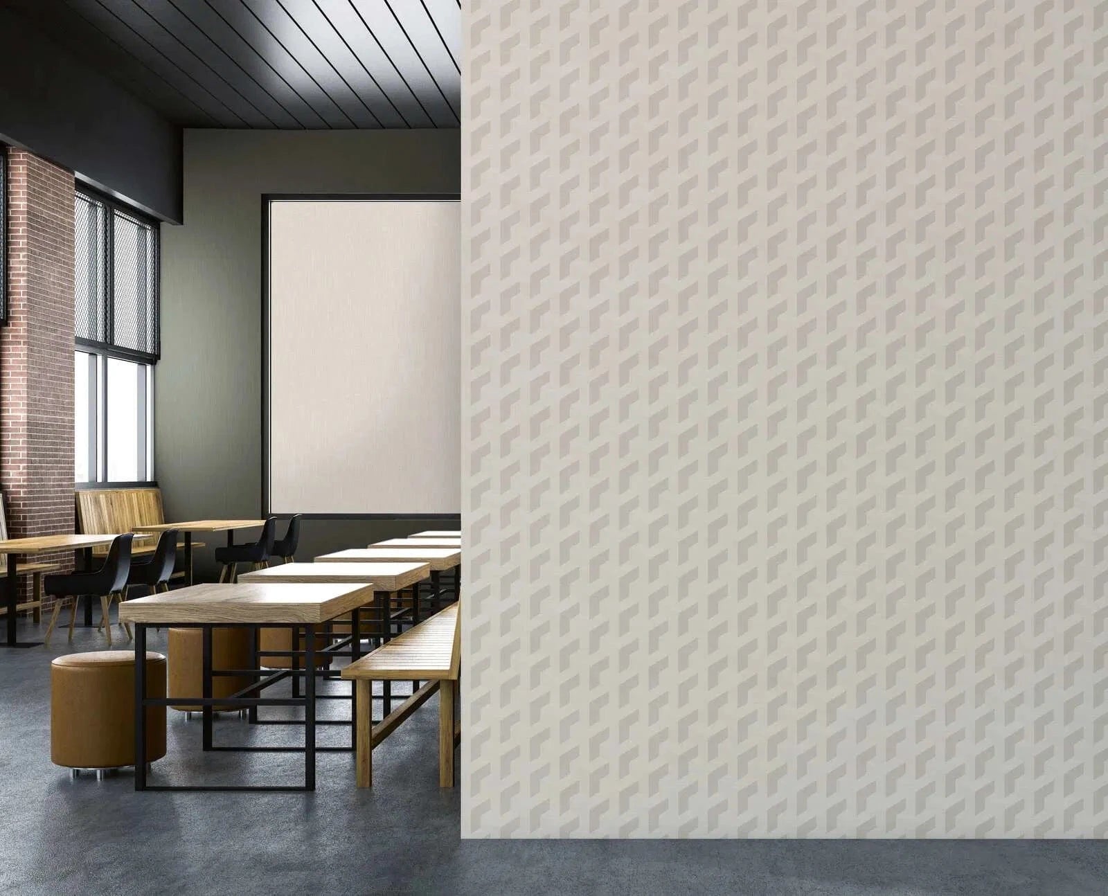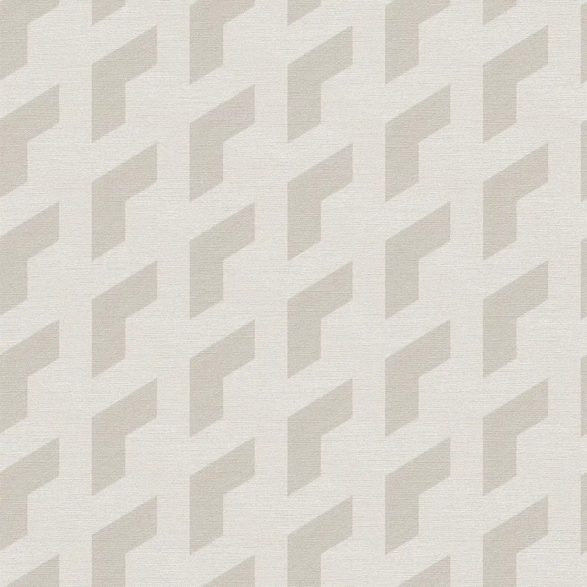 Daniel Hechterin vaaleanharmaa retro-3D-tapetti antaa seinille modernin mutta neutraalin tunnelman.