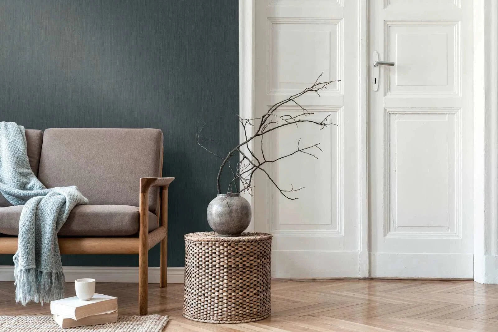 Daniel Hechterin tummanvihreä tekstiilitapetti luo hienostuneen ja rauhallisen tunnelman.