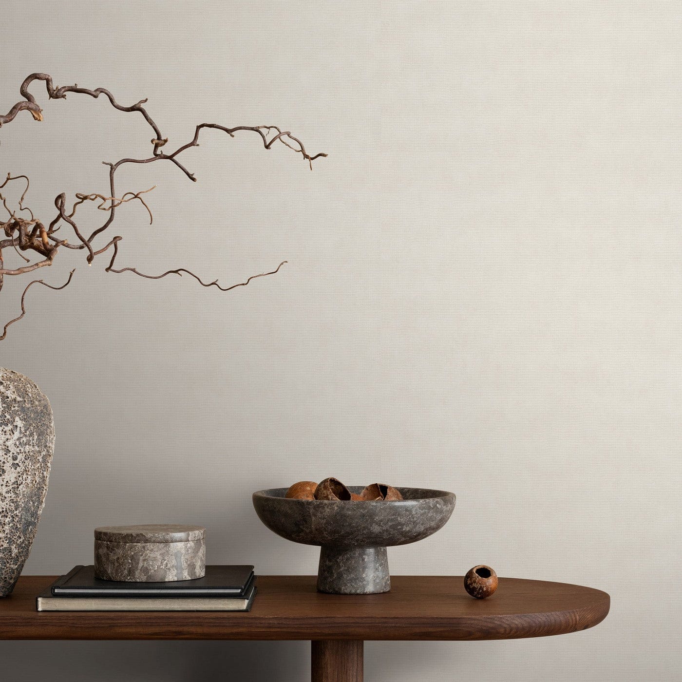 Yleismaailmallista eleganssia. Kevyesti hohtava kermanvärinen tapetti tuo huoneeseen valoa ja lämpöä ja sopii täydellisesti yhteen puuhuonekalujen kanssa.