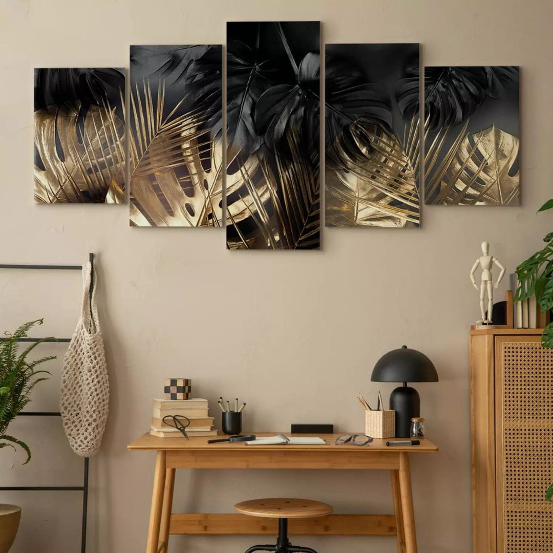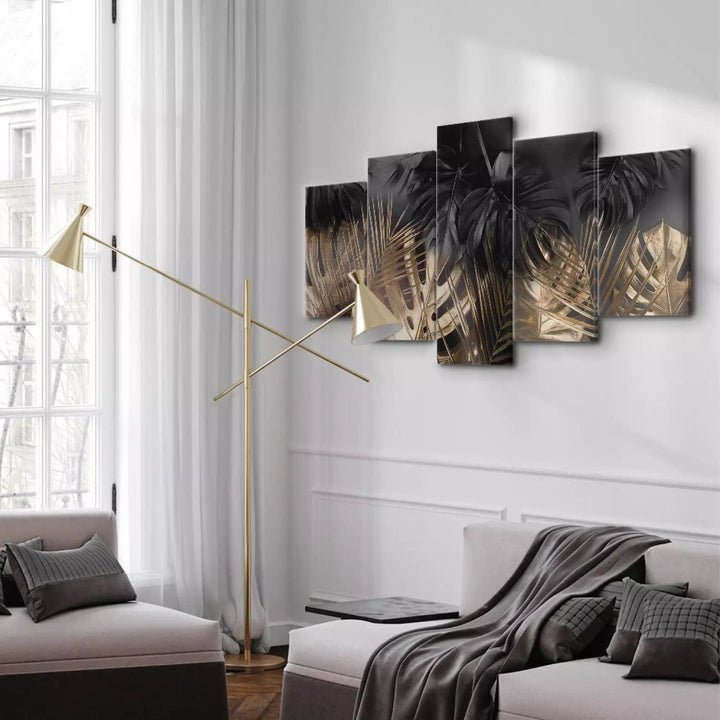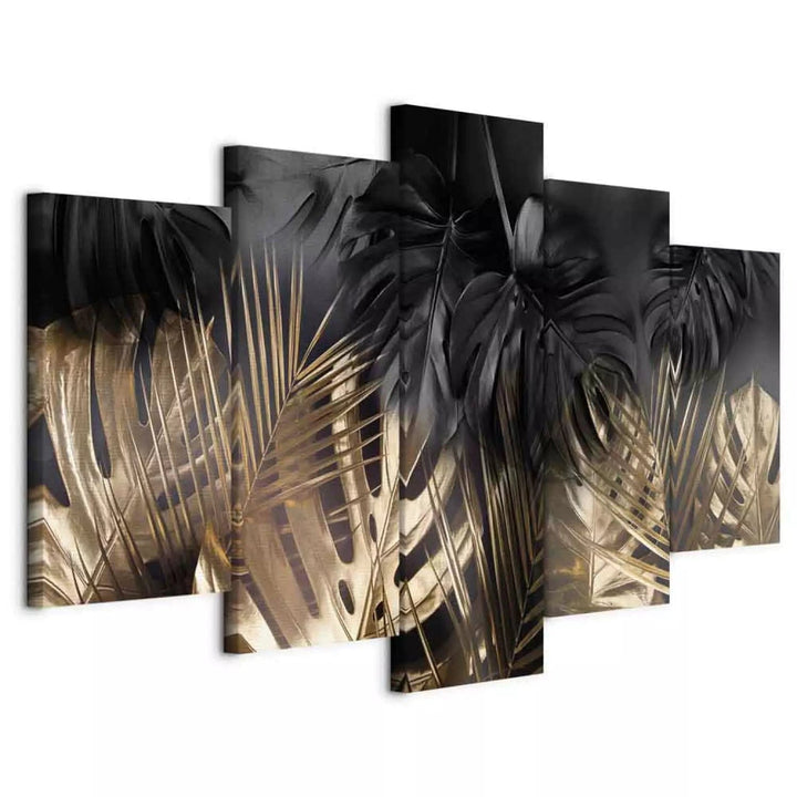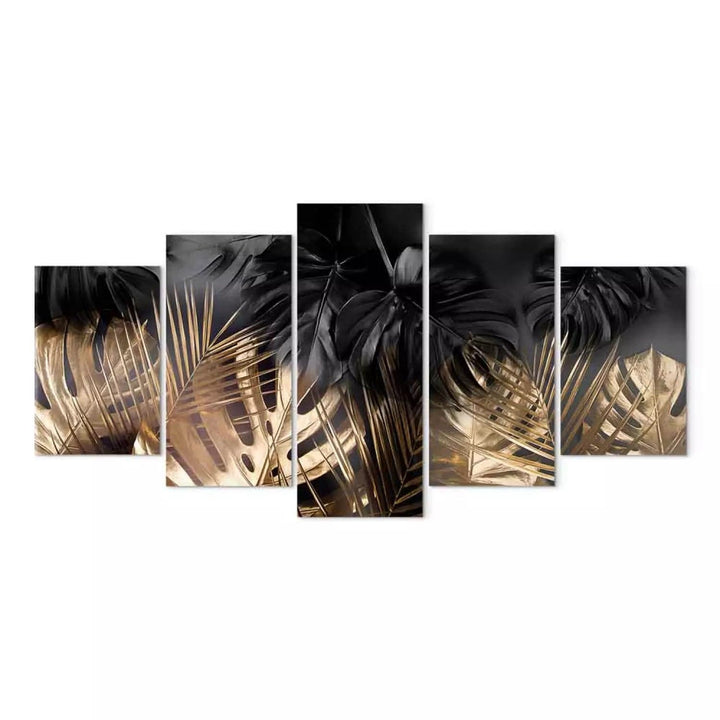 150x75 cm, Canvas-taulut trooppisia kullanvärisiä lehtiä tummalla taustalla, (x 5)