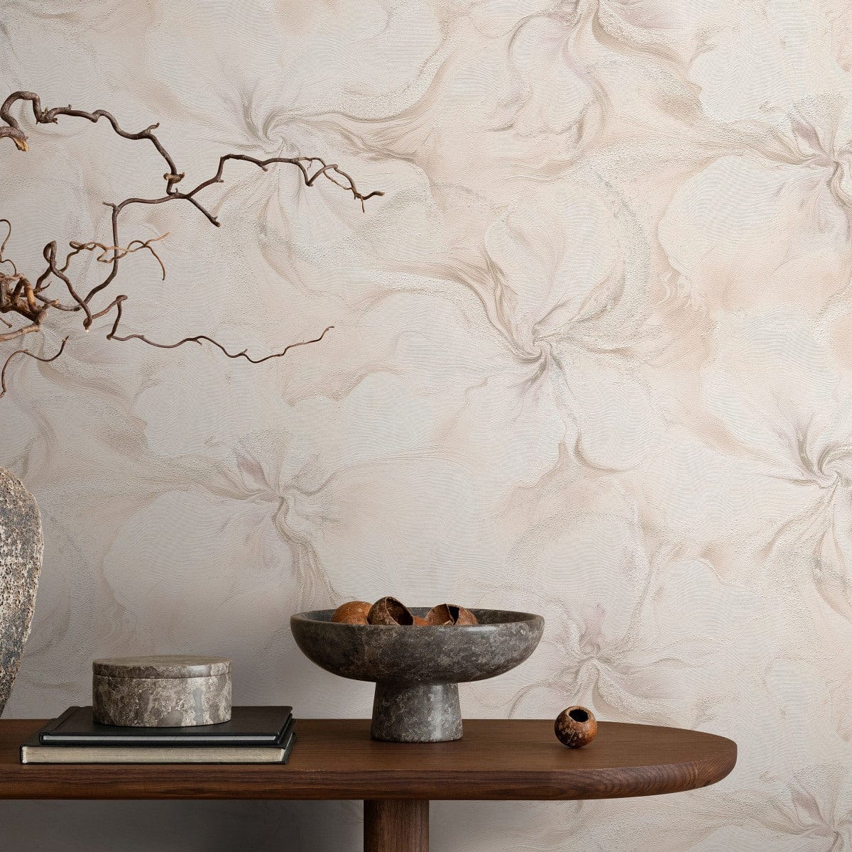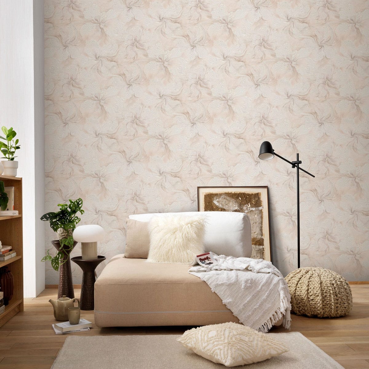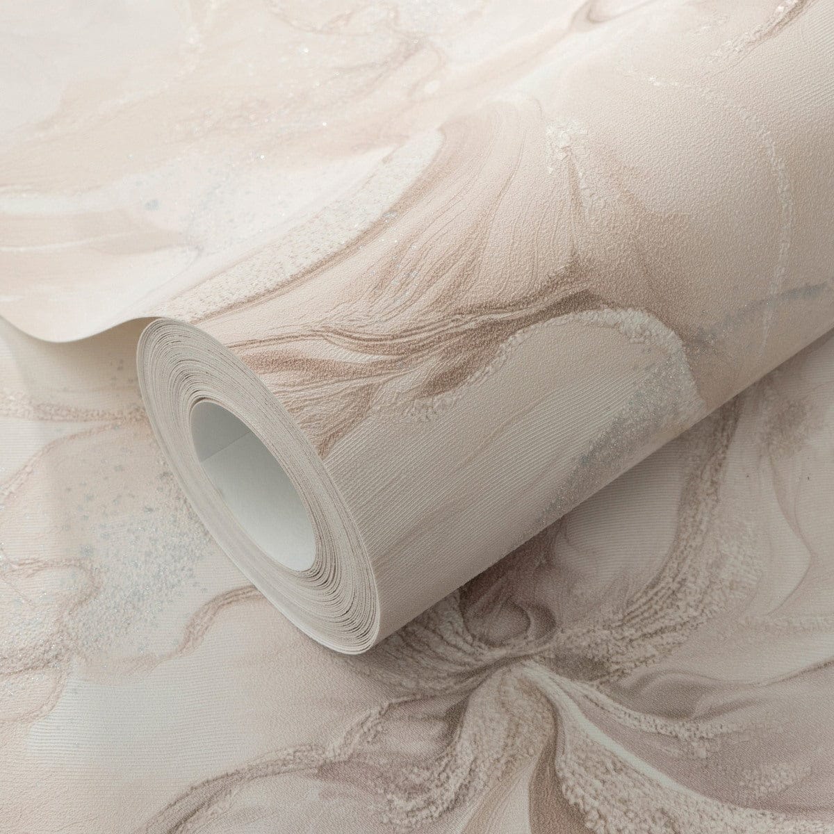 Moderni ja leikkisä. Vaaleanpunainen marmorikuvio, jossa on hohtavia elementtejä, on rohkea ja tyylikäs valinta, joka saa huoneen tuntumaan kodikkaalta mutta hienostuneelta.