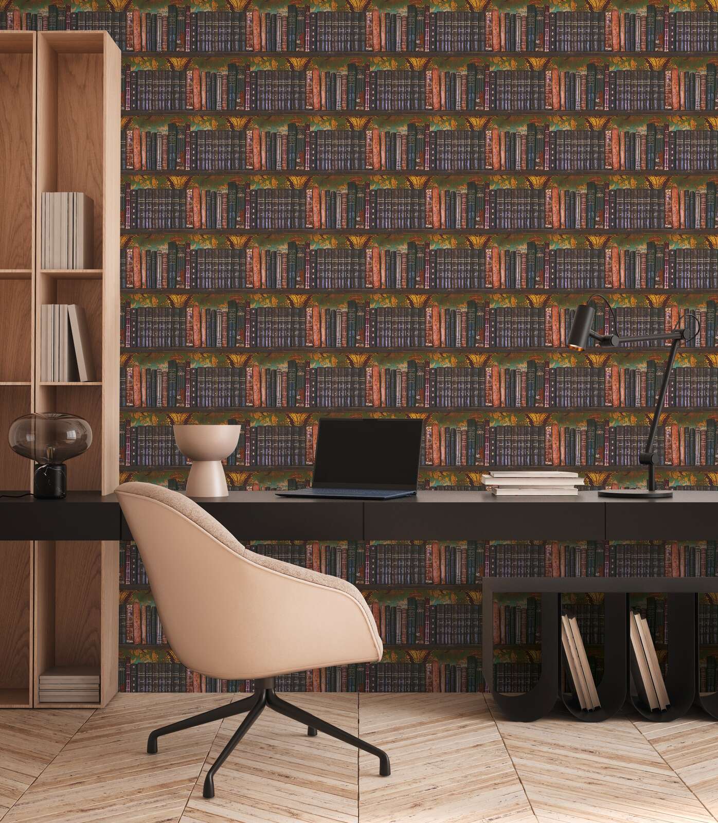 Tapetin kuviossa on klassinen kirjahylly, jossa on antiikkisia, nahkaisia kirjoja. Kirjojen selkämykset ovat rikkaita, tummanruskeita, tummanvioletteja ja lämpimiä kuparinsävyjä, ja niitä korostavat kultaiset kohokuvioinnit ja herkät koristeet. Joissakin selkämyksissä on filigraaniset kultaiset päivämäärät ja nimikirjaimet, jotka korostavat kirjaston nostalgista luonnetta. Taustalla on hohtava oliivinvihreä kuvio, johon on ripoteltu oranssinkeltaisia kukka-koristeita, jotka antavat kuviolle ylellisen ja kodikkaan ilmeen. Kaiken kaikkiaan tapetti luo lämpimän, kodikkaan tunnelman vintage-tyylillä ja muistuttaa vanhan yksityisen kirjaston kodikasta ilmapiiriä.