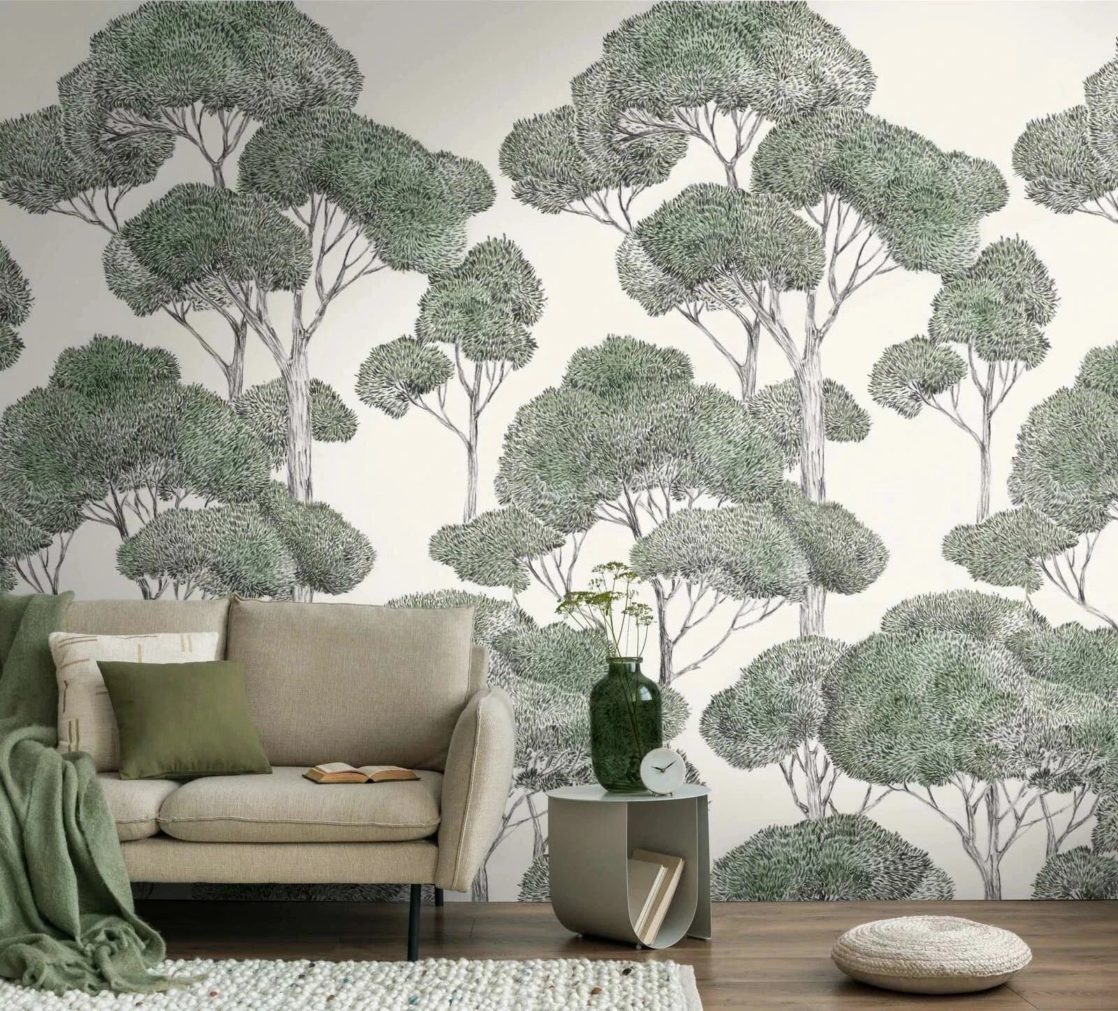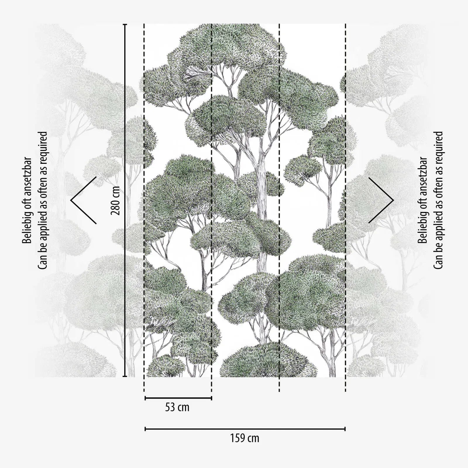 Motivi kuvaa tyyliteltyä puumaisemaa, jossa on herkästi piirrettyjä mäntyjä. Puiden latvat muodostavat hienoja, lähes graafisia rakenteita eri vihreän sävyissä, jotka antavat lehdille dynaamisen eloisuuden. Puunrungot ja oksat on piirretty herkillä harmailla sävyillä ja hienoilla viivoilla, mikä antaa maisemalle keveyttä ja läpinäkyvyyttä. Tausta on puhdas valkoinen, mikä saa puut näyttämään leijuvilta ja ilmavilta, ja kuvio näyttää erityisen raikkaalta ja rauhalliselta. Kokonaisvaikutelma on moderni, luonnollinen ilme, joka muistuttaa japanilaisia mustepiirroksia ja luo rennon, harmonisen ilmapiirin.
