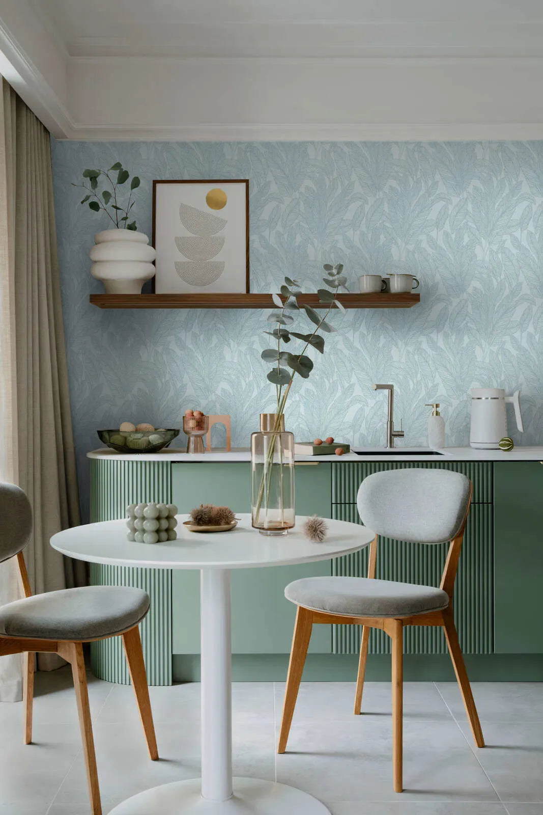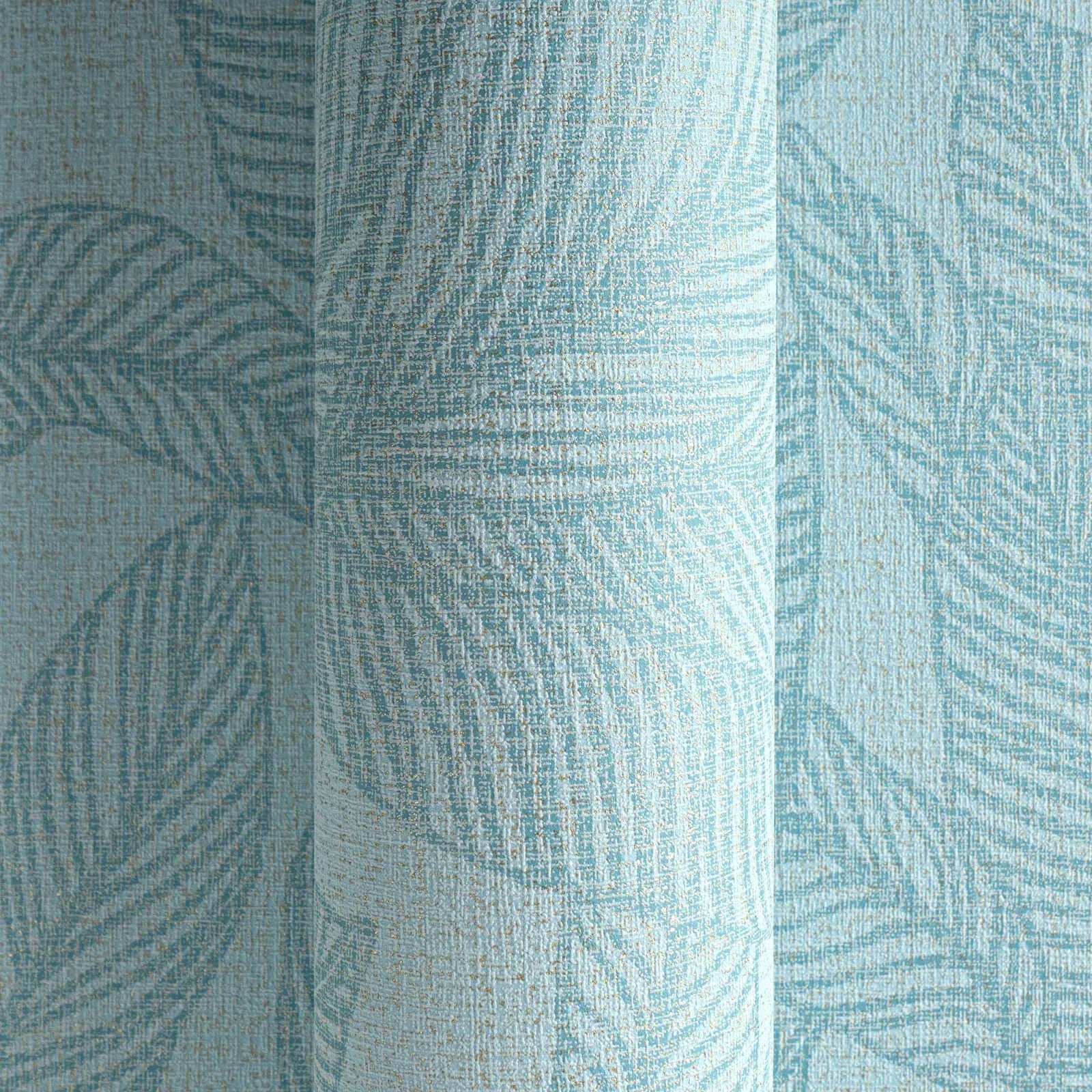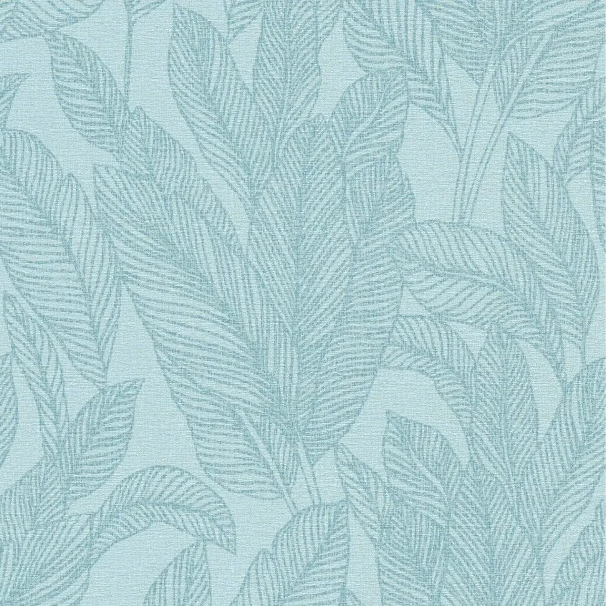 Lielas, sulīgas lapas ar smalkām, paralēlām līnijām kā lapu vēnām klāj visu šo tapetu fonu. Raksts ir skaidri iedvesmots no dabas un atgādina eksotiskus augus, piemēram, banānu vai palmu lapas. Krāsu gamma ir monohroma un vēsās zilo toņu krāsās: gaiši zilo fonu šķērso benzīna krāsas, nedaudz tumšākas līnijas, kas smalki izceļ lapas. Stilizētais attēlojums un smalkā krāsu spēle piešķir motīvam mierīgu, modernu izskatu. Kopējais iespaids ir gaišs un svaigs; tapetes telpai piešķir maigu dzīvīgumu un dabiskuma pieskārienu, neizskatoties uzmācīgi.