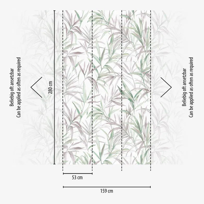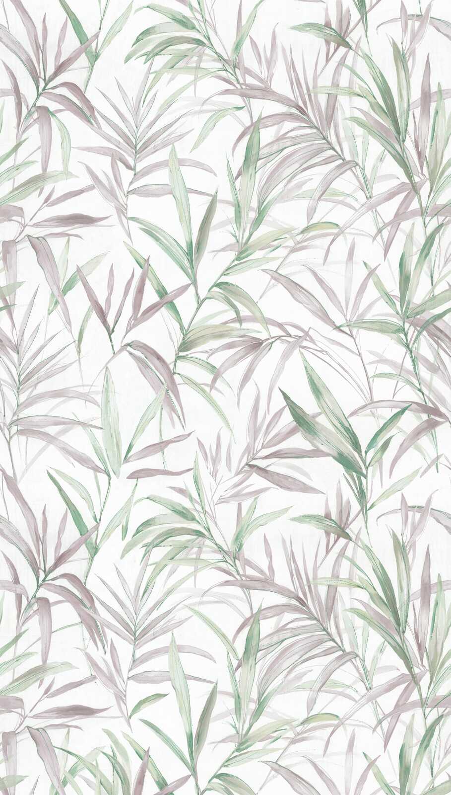 Hienovaraiset, akvarellimaiset palmunlehdet kiemurtelevat lempeästi kaartuvina linjoina kirkkaalla, luonnonvalkoisella pohjalla. Kuvio tekee vaikutuksen hienovaraisilla linjoillaan ja näyttää erityisen kevyeltä ja ilmavalta löyhän, käsinmaalatun ilmeensä ansiosta. Väripaletti on hienovarainen ja hillitty: vaaleanvihreän eri sävyisiä lehtiä sekoitetaan hieman purppuranharmaisiin sävyihin, mikä antaa kuviolle hienovaraista eleganssia ja luonnollisuutta. Viileiden vihreiden sävyjen ja pastellinviolettien korostusten yhdistelmä luo rauhoittavan ja ystävällisen ilmapiirin, joka säteilee sekä raikkautta että kodikkuutta. Kaiken kaikkiaan kaunis kukka- ja kasvitieteellinen kuvio on moderni mutta muistuttaa klassisia akvarelli- ja luontotutkimuksia kuvituskirjoissa.