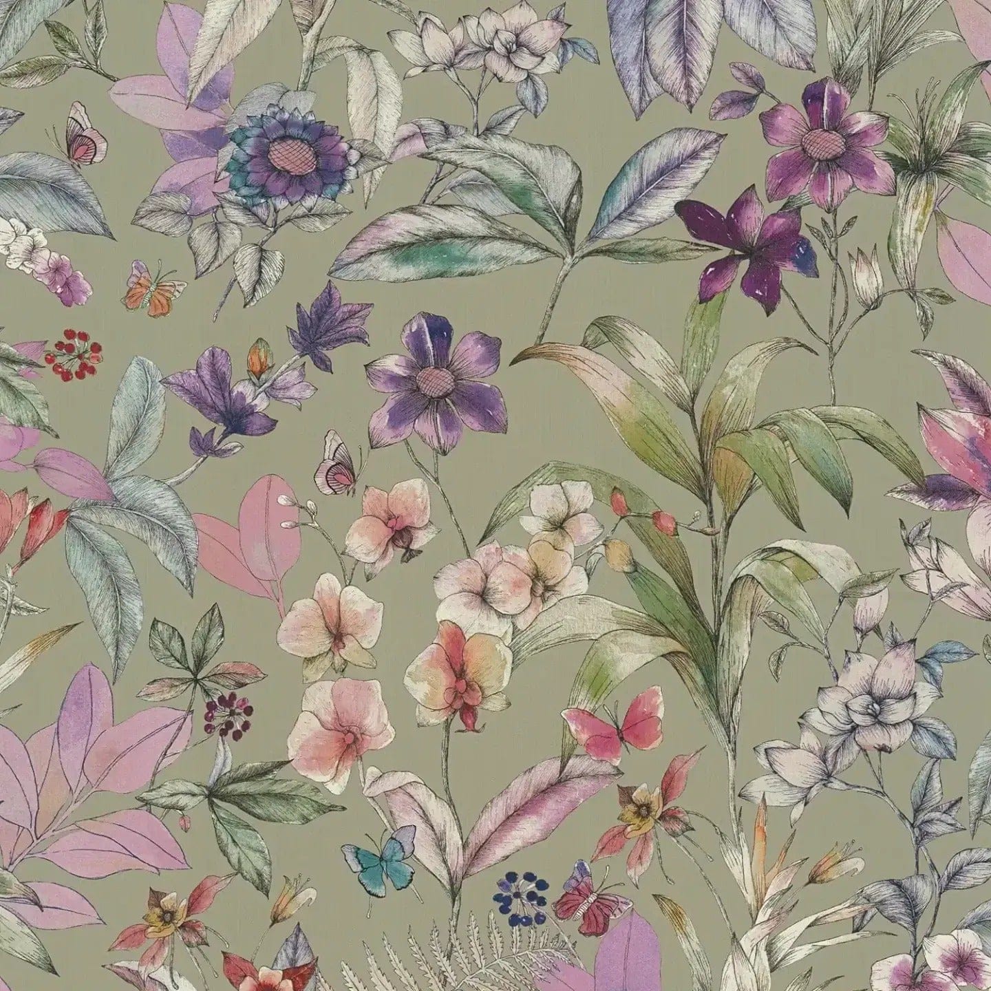 Tapetin kuosi kuvaa yksityiskohtaista, kuvitettua kukkakuviointia mattapintaisella, oliivinvihreällä taustalla, jossa on hieno pystysuora tekstuuri. Suuret lehdet, joista osa on korostettu vaaleanvihreällä ja pehmeällä vaaleanpunaisella, on järjestetty orgaanisesti koko pinnalle. Niiden välissä kukkivat fantasiakukat haalistuneissa violetin, vaaleanpunaisen ja sinisen sävyissä; kukilla on hienot ääriviivat ja ne näyttävät melkein siltä kuin ne olisi piirretty lyijykynällä ja sitten väritetty vesiväreillä. Vaaleansininen perhonen, jonka reunat ovat mustat, tuo eloisan aksentin. Pienet marjamaiset muodot syvässä violetissa ja herkät, lähes läpikuultavat oksat lisäävät leikkisiä yksityiskohtia. Harmoninen pastelliväripaletti luo rauhoittavan vaikutelman ja elegantin, luonnollisen ilmapiirin, jossa on taiteellinen, romanttinen luonne.