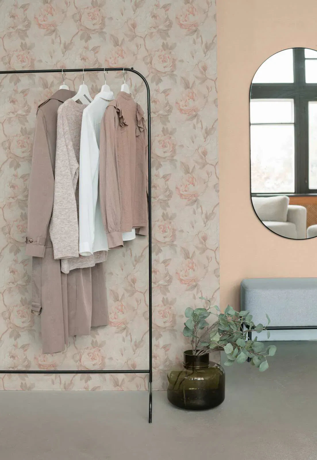 Hienostuneet, suurikokoiset kukkakuvioinnit vesiväritekniikalla luonnehtivat tätä tapettikuosia. Kukkien muodot sulautuvat hellästi toisiinsa, ja niiden pehmeät ääriviivat muistuttavat pinnalle vapaasti siroteltuja terälehtiä. Värimaailmassa hallitsevat hyvin vaaleat pastellisävyt, pääasiassa vaaleanpunaiset ja aprikoosin sävyt, joissa on lämmin hiekan sävy. Hienovaraiset, hieman ruskehtavat sävyt lisäävät syvyyttä heikentämättä kokonaisvaikutelmaa. Tapetin tekstuuri on hieman rakenteellinen, mikä antaa kuviolle tiettyä eloisuutta ja syvyyttä. Kokonaisvaikutelma on romanttinen, kevyt ja naisellinen, mikä sopii erinomaisesti huoneiden ystävällisen, avoimen ja rauhoittavan tunnelman luomiseen.