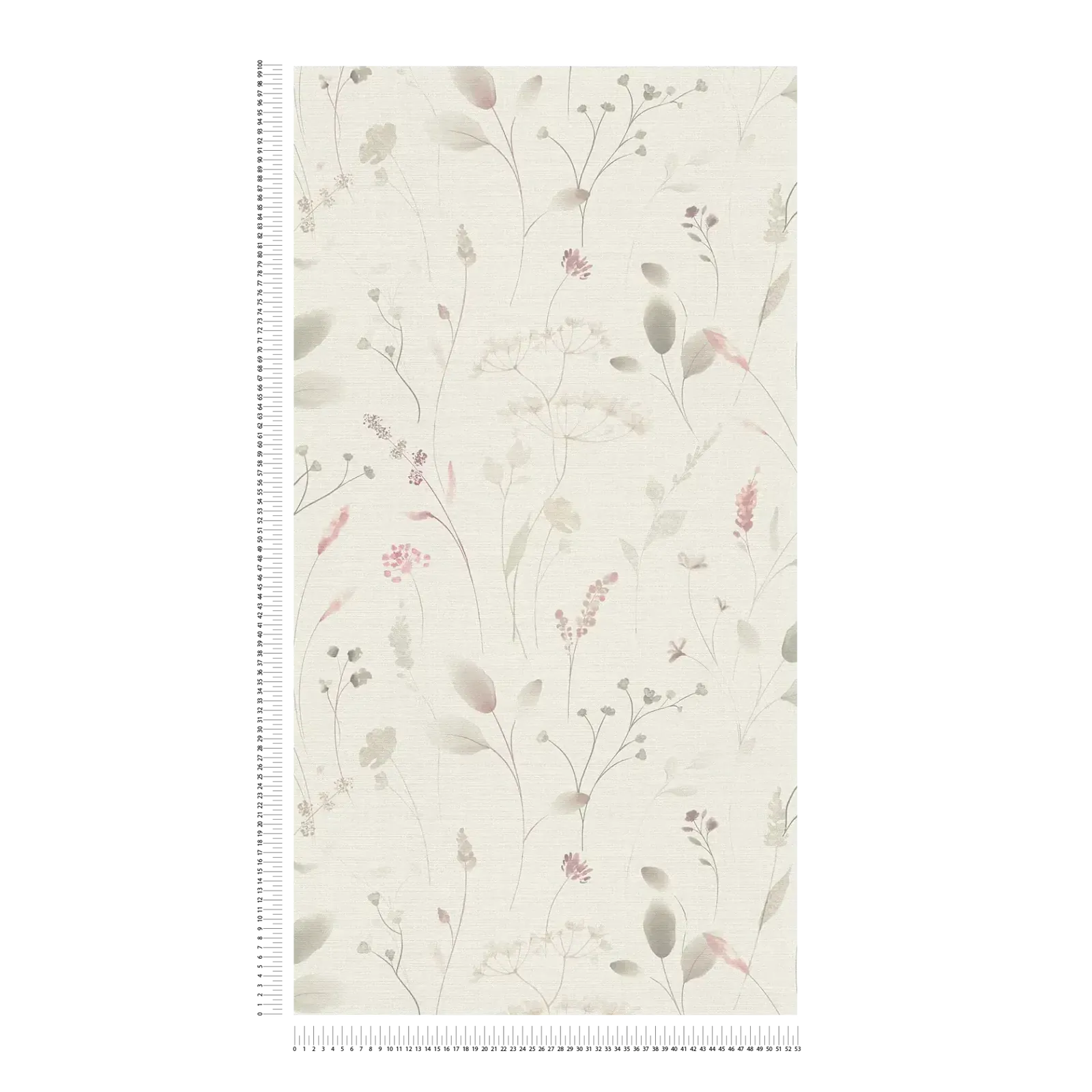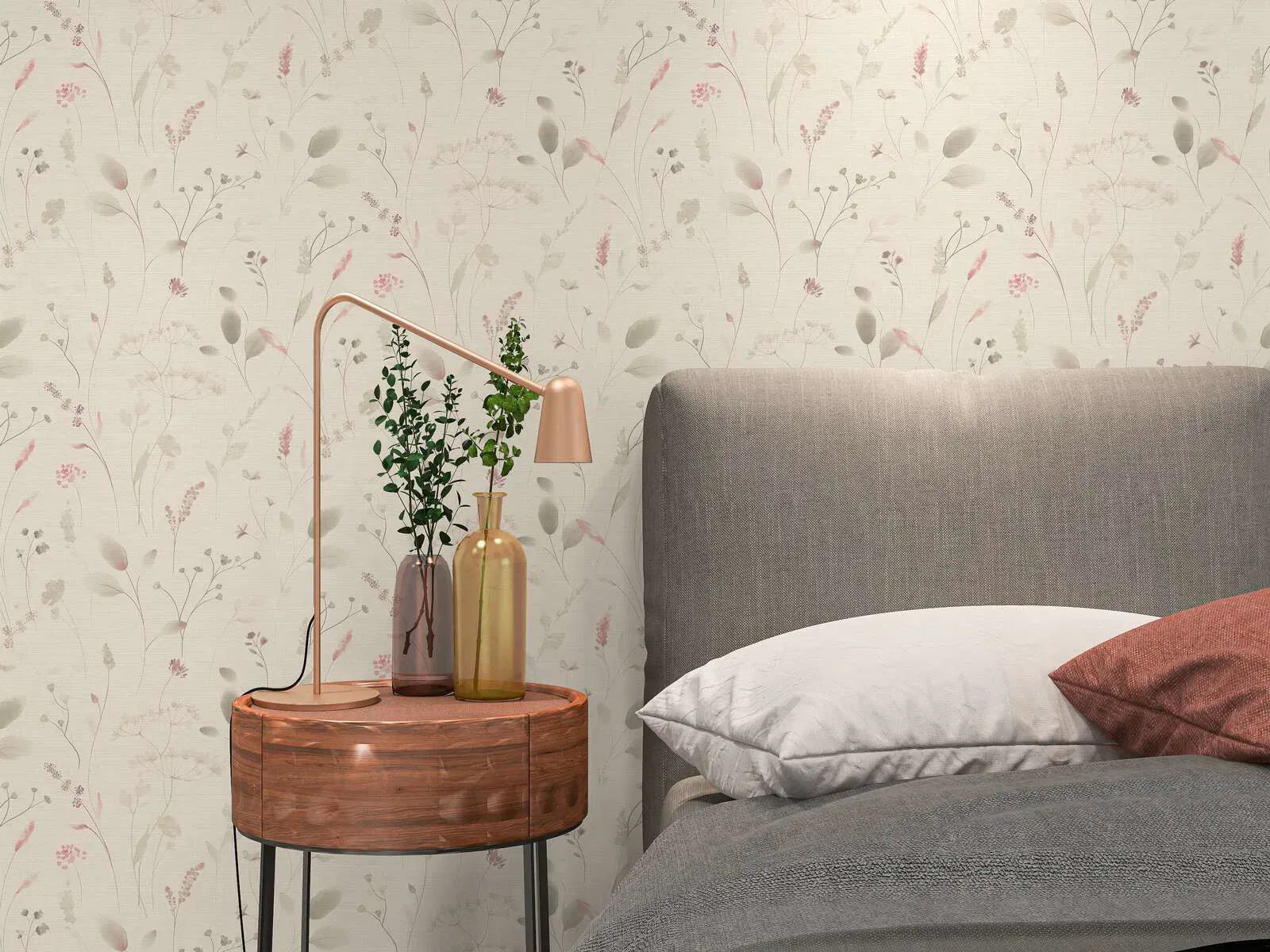 Tämä tapetti on koristeltu herkillä kukka-aiheisilla elementeillä pehmeissä vesiväri sävyissä. Herkät lehdet ja ruoho näyttävät olevan maalattu kevyellä kädellä ja ripoteltu vapaasti ja leikkisästi vaalealle, kermanväriselle taustalle. Värimaailma koostuu pääasiassa pastellisävyisistä vaaleanpunaisista, violeteista ja vihreistä sävyistä, jotka luovat miellyttävän rauhallisen ja luonnollisen tunnelman. Tyyli muistuttaa moderneja, minimalistisia kasvitieteellisiä kuvituksia, joissa on ripaus skandinaavista keveyttä. Hienostuneet viivat ja sulavat värisiirtymät luovat rennon, ystävällisen ilmapiirin ja saavat huoneet tuntumaan avoimilta ja harmonisilta. Tapetin hieno tekstuuri korostaa luonnollista vaikutelmaa ja luo hienovaraisen, elegantin syvyysvaikutelman.