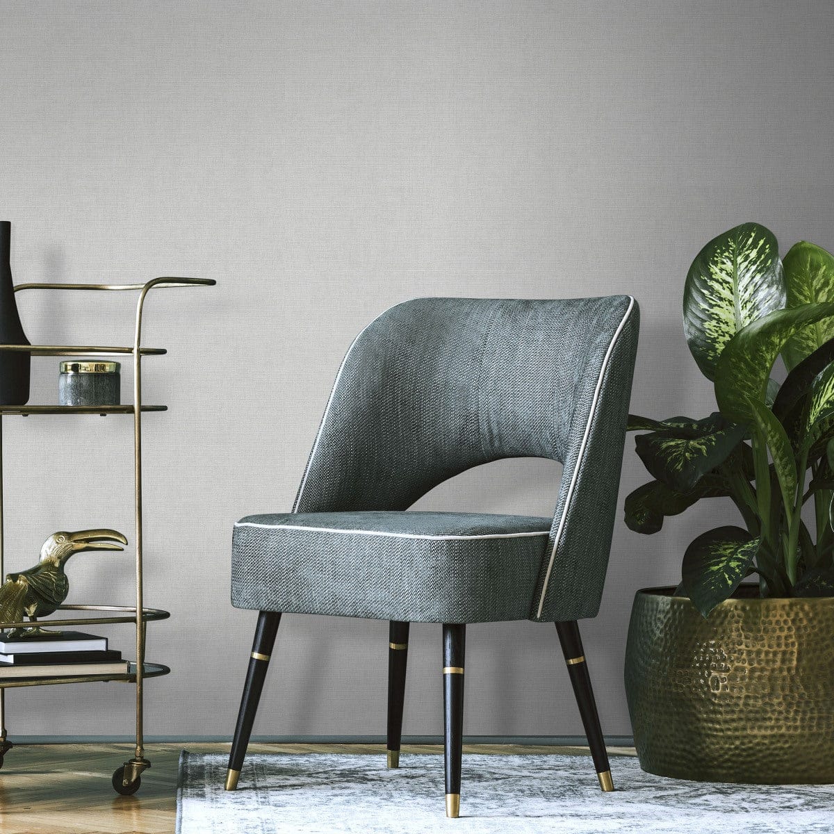 Moderni minimalismi. Vaaleanharmaa on monipuolinen tausta, joka antaa huonekaluille mahdollisuuden erottua. Pinnan kiilto estää seinää näyttämästä tylsältä.