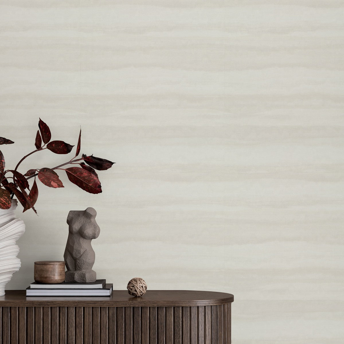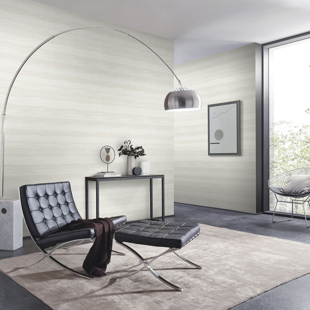 Virtaavat linjat. Hienovarainen aaltoileva rakenne kermanvärisenä, joka heijastaa hieman valoa ja antaa seinille liikettä ja keveyttä.