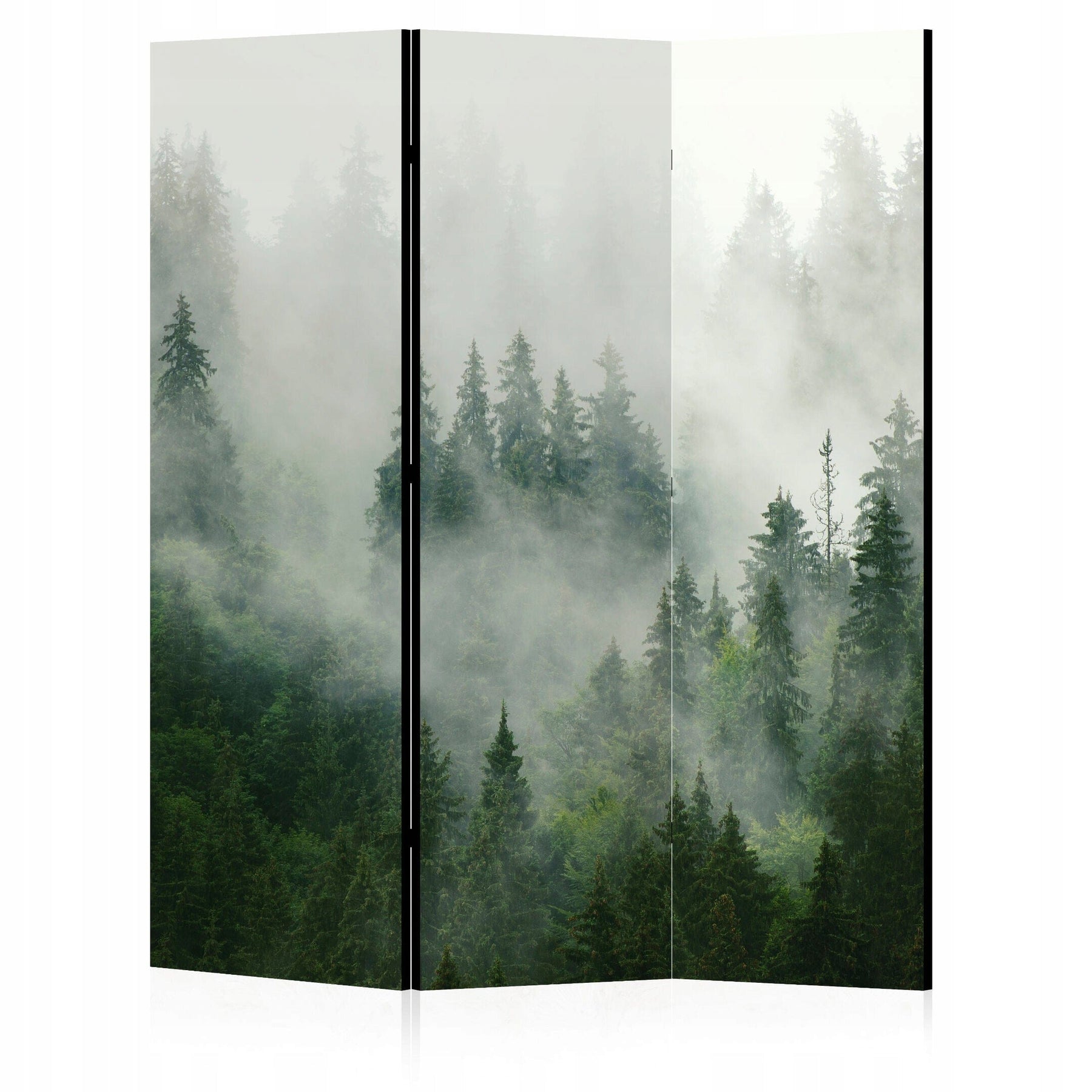 Yksipuolinen tilanjakaja, 135x172, Sumuinen metsä, luonnollisilla sävyillä, rauhallinen ja pohjoismainen tunnelma