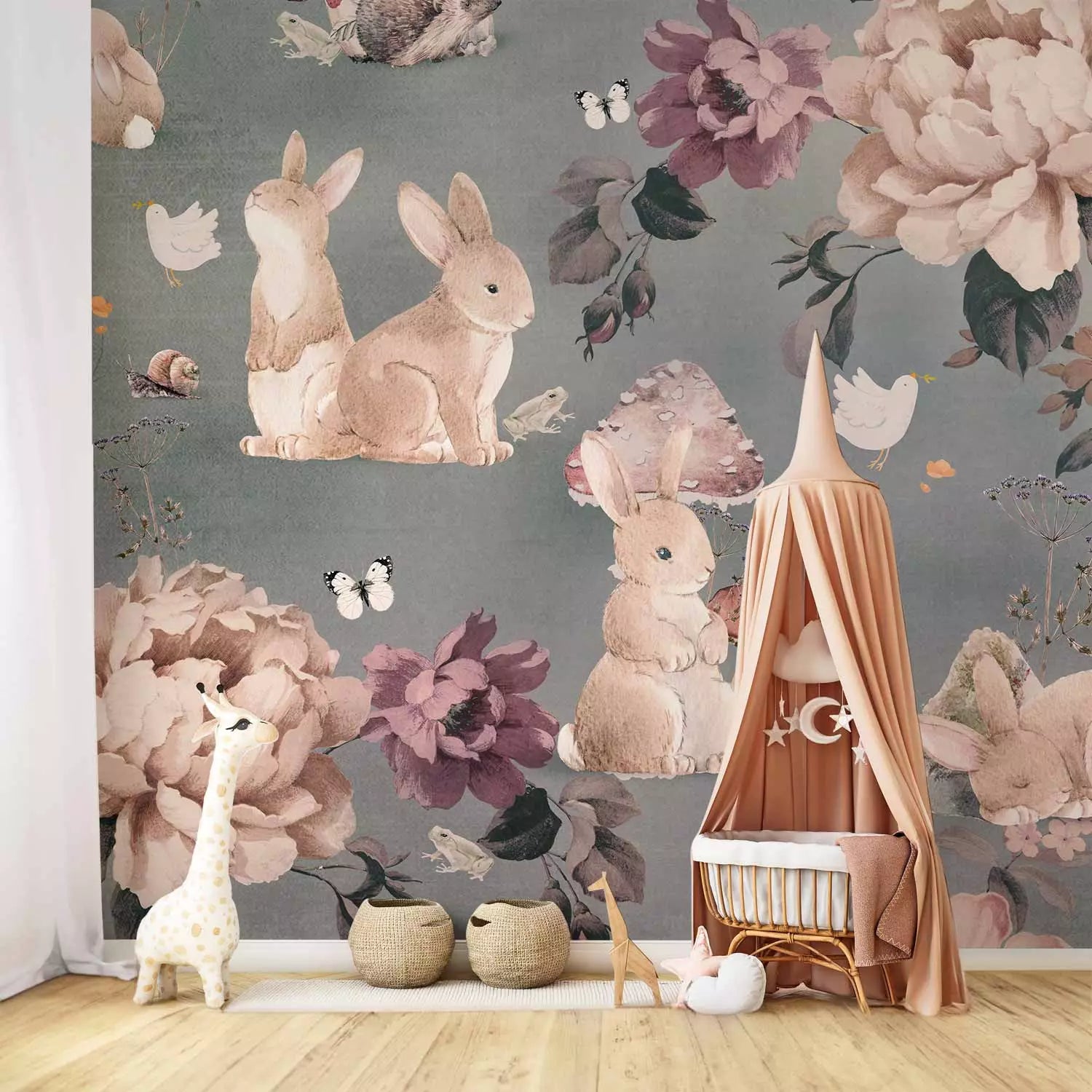 Fototapetai – Miško gyvūnai tarp gėlių ant pilko fono, 149203