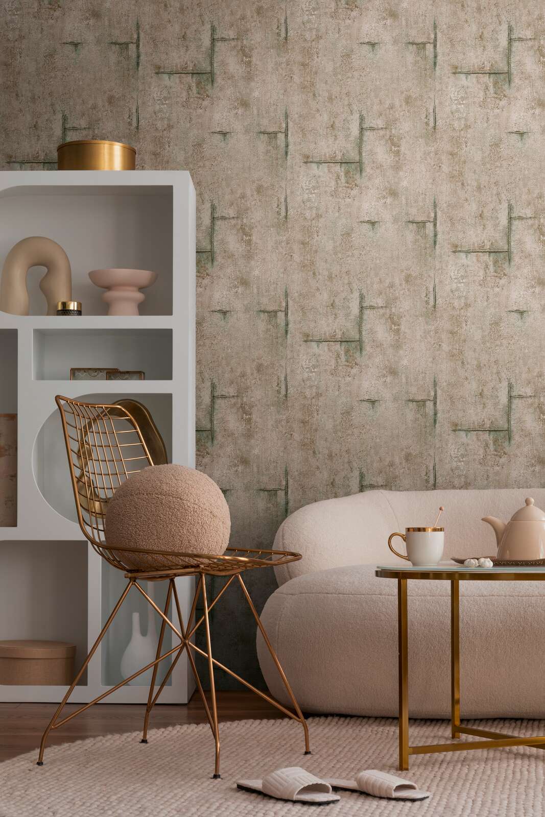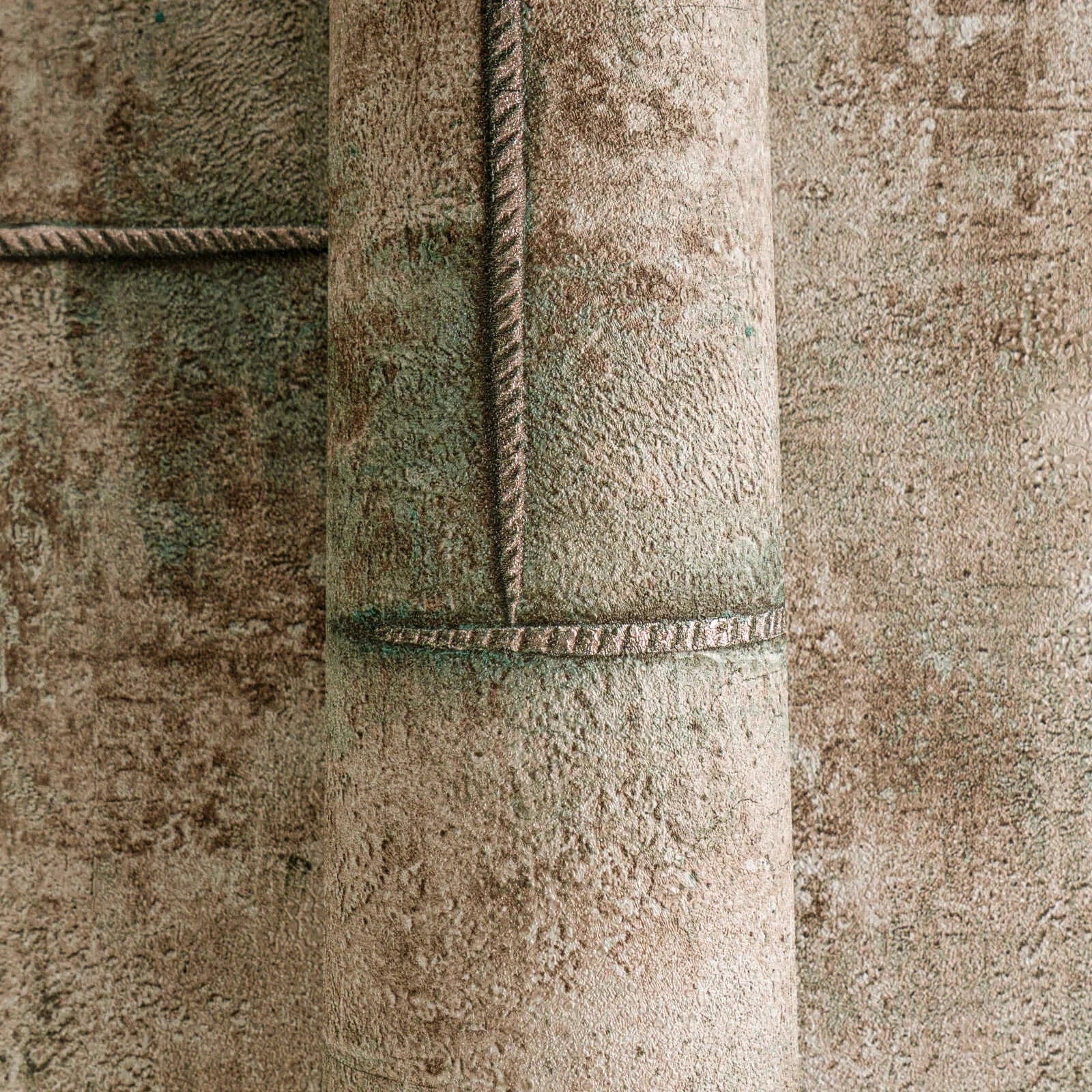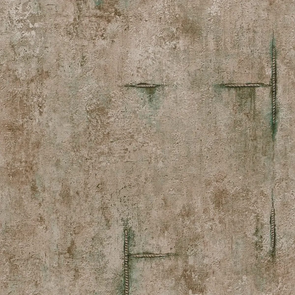 Šo tapetu motīvs atgādina raupju betona virsmu, kas vietām izskatās nolietota un izbalējusi. Pamattons ir zemes krāsas, smilškrāsas pelēkbrūns ar izkliedētām, delikātām balto baložu pelēkā un nedaudz zaļgani zilo toņu niansēm, kas rakstam piešķir patinas pieskaņu. Izolētas ar rūsas izskatu pastiprinājuma stieņi sadala divdimensionālo telpu un piešķir mērķtiecīgus akcentus. Virsmā redzama struktūra un raupjums, tā izskatās gandrīz trīsdimensiju, it kā uzklātas dažādas materiāla kārtas. Stils ir industriāls un urbāns, ar nelielu vintage raksturu. Kopumā krāsa un forma rada neapstrādātu, autentisku atmosfēru, kas ir gan vēsa, gan neparasta, ideāli piemērota modernam loftam vai industriālai videi.