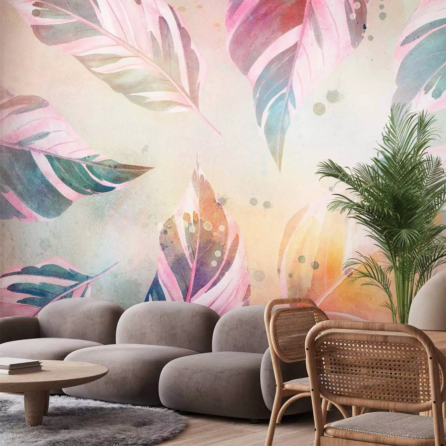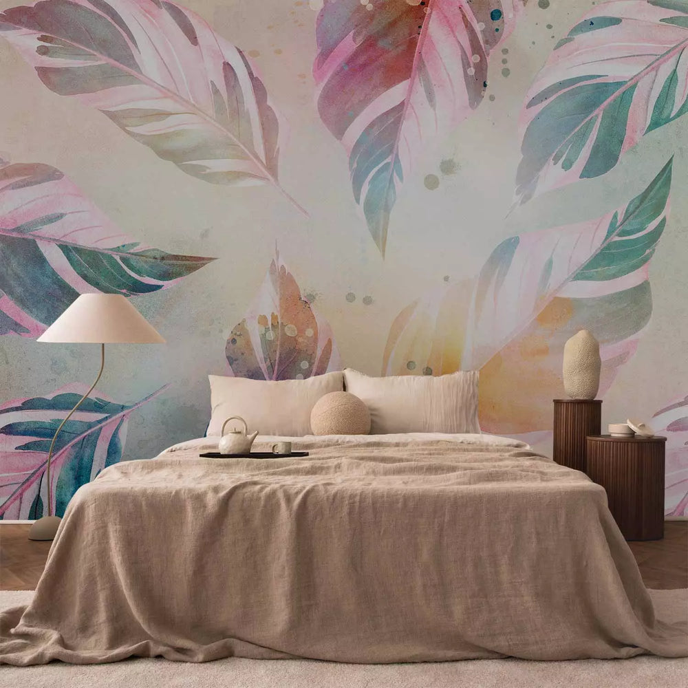 Fototapetai Gamtos poezija – rausvai žali lapai spalvingame fone, 143786