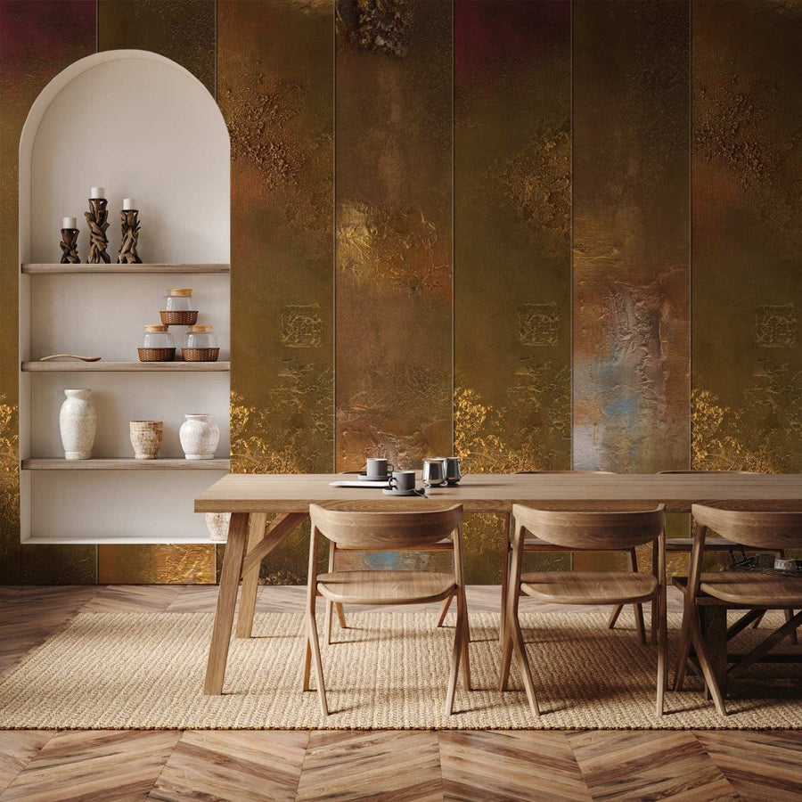 Tapetai ir fototapetai: papuoškite svetainę ar valgomąjį aukso spalvos tapetais, sukurdami prabangų, rafinuotumą spinduliuojantį foną. Idealiai tinka kambariams, kuriuose norite suteikti spindesio.