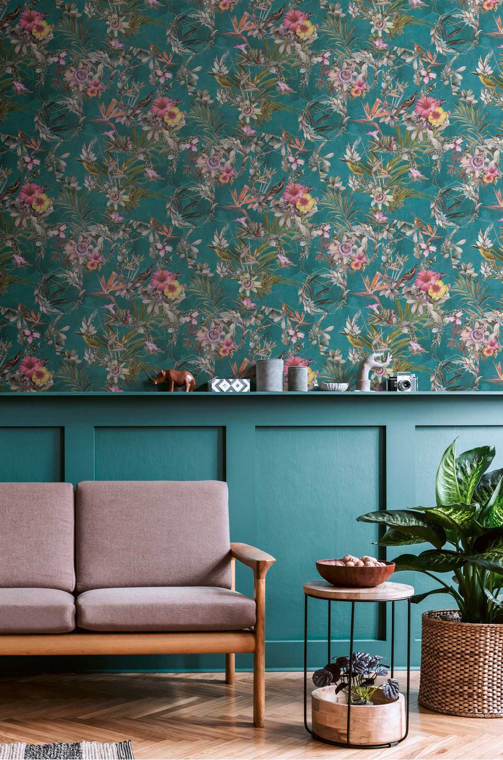 Tapetai su egzotinių gėlių ir paukščių turkio spalvos, 1351527