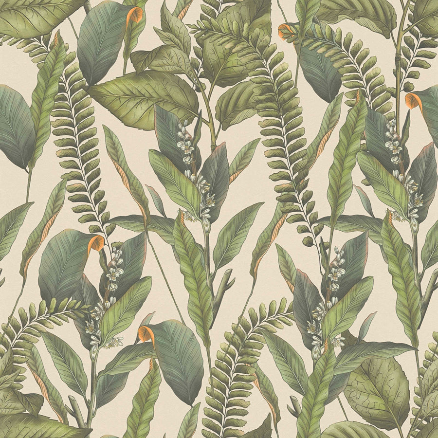 Džiunglių tapetai su lapais ir gėlėmis, matiniai: žalia ir kreminė, 1401624