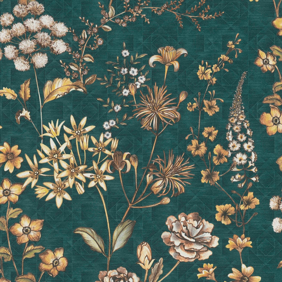 Tapetes ar ziedu rakstu uz grafiska zilganzaļa fona - 1374006 AS Creation