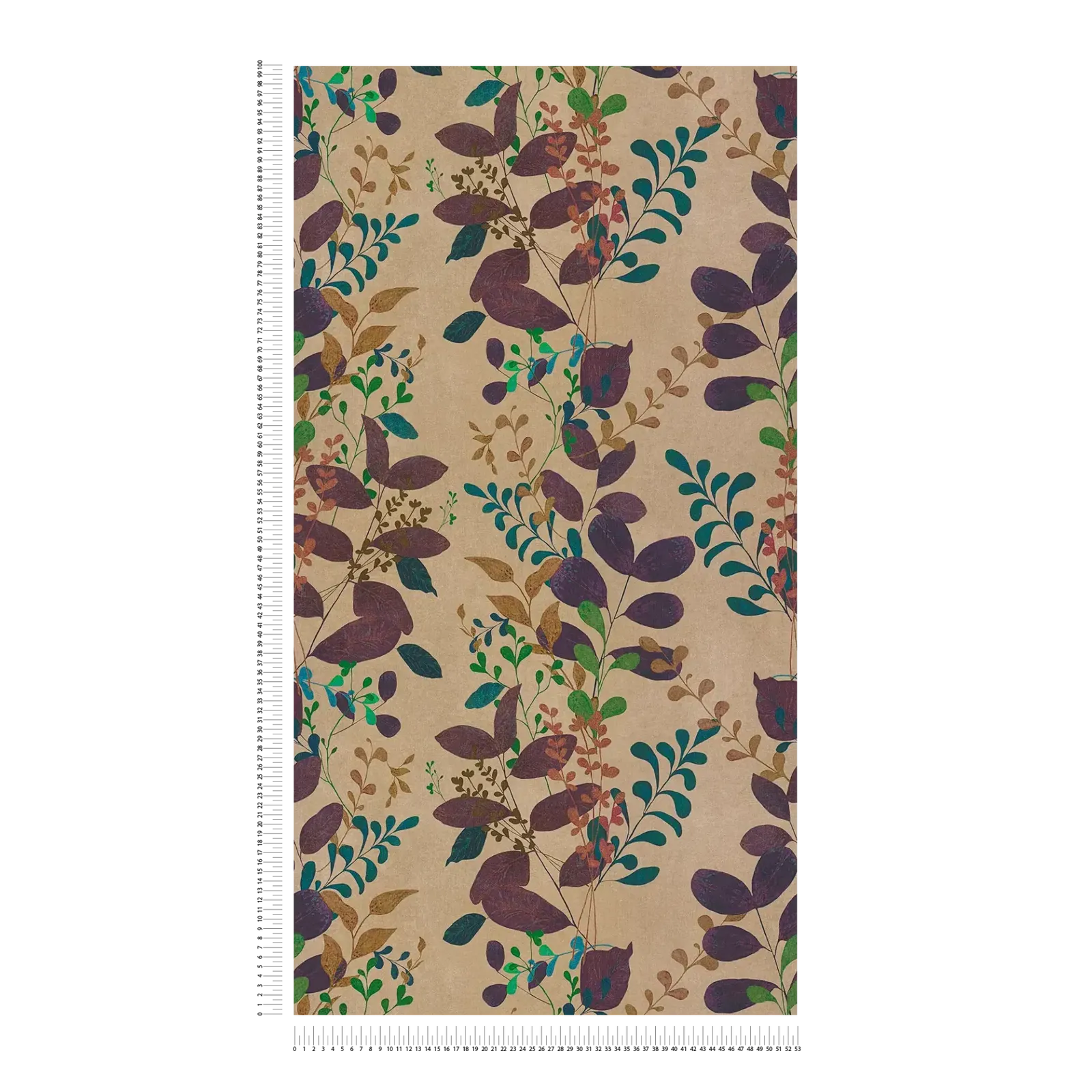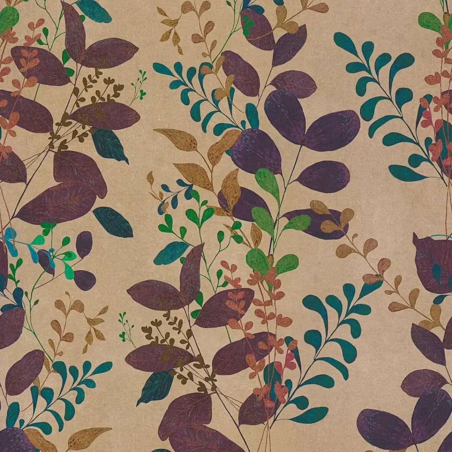 Didelis botaninis motyvas su įvairiais lapais ir subtiliais šakelių atspalviais atsiskleidžia ant šilto, smėlio spalvos fono. Lapai yra sodrūs, gilūs uogų atspalviai, tamsiai žali ir ryškūs benzino spalvos, kartais pertraukiami rusvais, beveik vario spalvos akcentais. Kai kurios lapų gyslos ir detalės yra labiau išryškintos, suteikdamos raštui gyvą ir šiek tiek žaismingą išvaizdą. Lapų struktūros yra stilizuotos, tačiau dėmesys sutelktas į natūralias formas ir organiškus kompozicijos elementus, kurie sukuria harmoningą ir natūralų bendrą vaizdą. Spalvos kontrastuoja su subtilia pagrindine spalva, suteikdamos tapetams draugišką, jaukų ir modernų išvaizdą. Vertikali fono tekstūra pabrėžia rankų darbo pobūdį ir suteikia dizainui papildomo gylio ir šilumos.