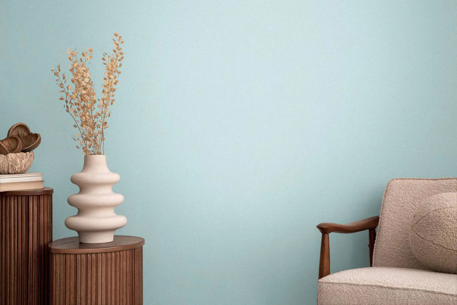 Tapetēm ir smalka, neuzkrītoša struktūra ar smalki austu tekstūru, kas atgādina linu. Krāsu gamma sastāv no maiga, gaiša pasteļtoņa zila ar nelielu pelēka toņa pieskaņu, kas virsmai piešķir mierīgu, svaigu izskatu. Raksts ir ļoti atturīgs, bez uzkrītošiem ornamentiem vai skaidriem grafiskiem elementiem. Tas rada vieglu, harmonisku kopējo izskatu, ko var kombinēt dažādos veidos un kas telpām piešķir vēsu, skaidru un relaksētu atmosfēru. Maigais krāsu iespaids rada nomierinošu efektu un veido draudzīgu, modernu gaisotni.